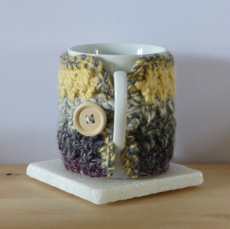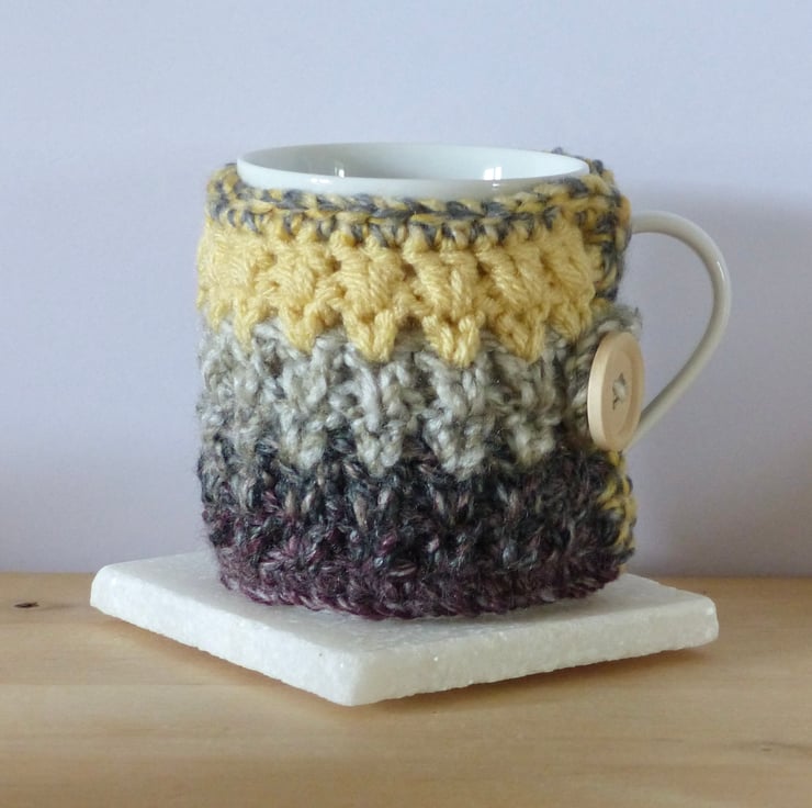 A crocheted Mug Cosy in a chunky variegated yarn in shades of Grey and Aubergine and a chunky Buttermilk coloured yarn.