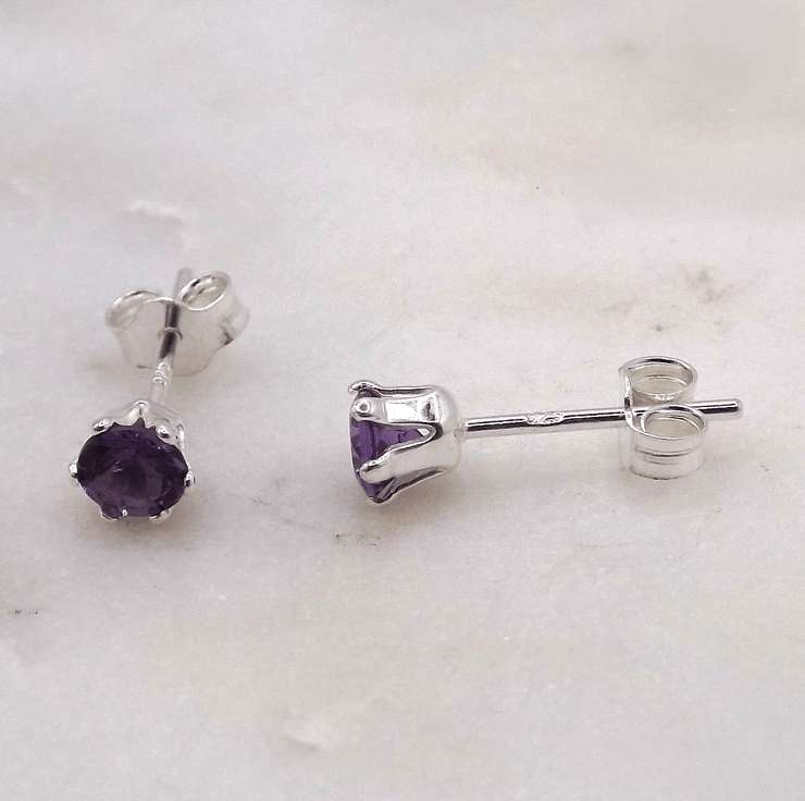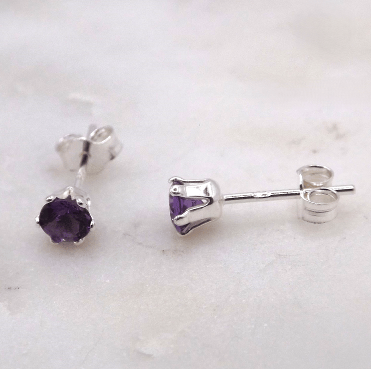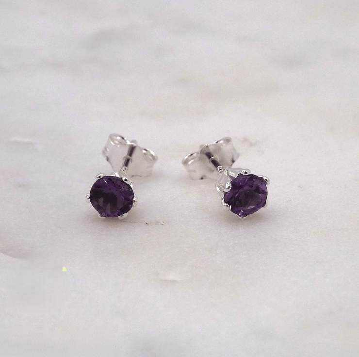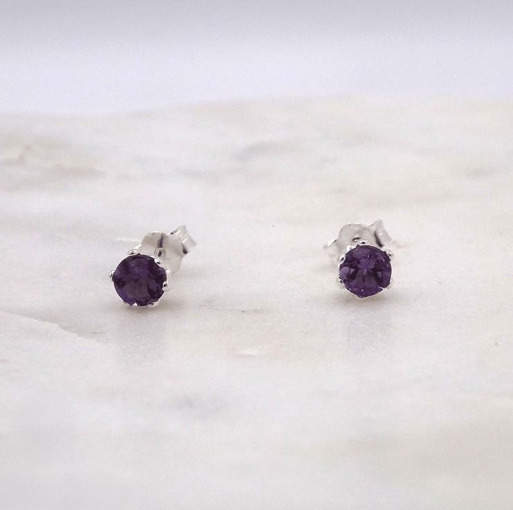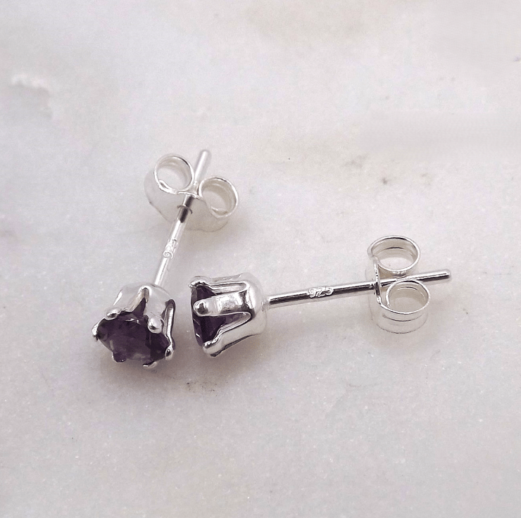 African Amethyst Facet 4mm Gemstone 6 Prong Facet Sterling Silver Stud Earrings.