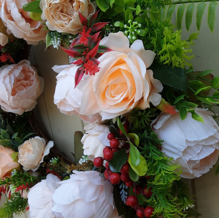 46cm wreath, with creams and coral peonies, coral roses, red berries