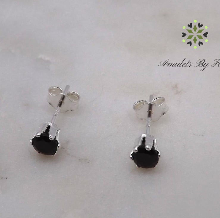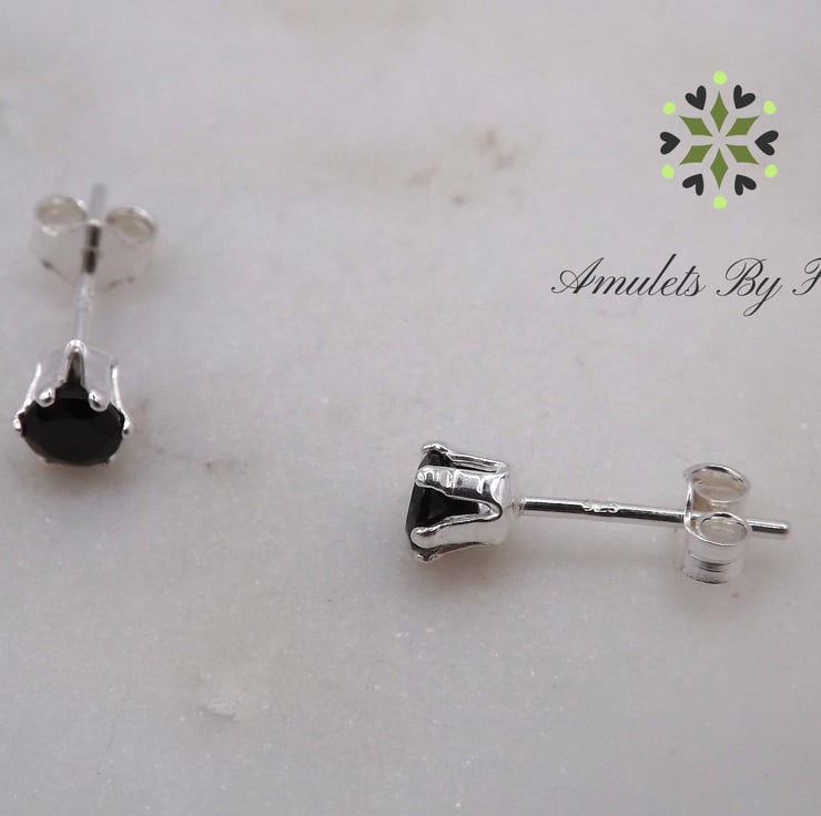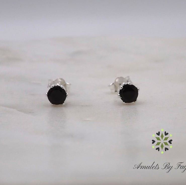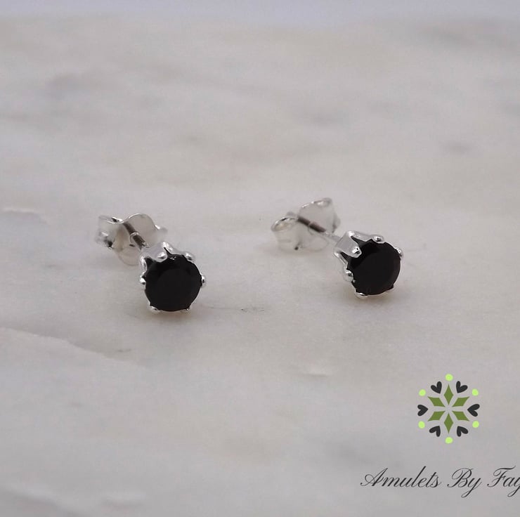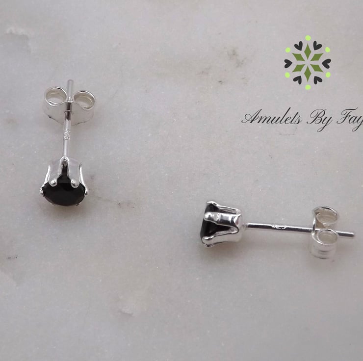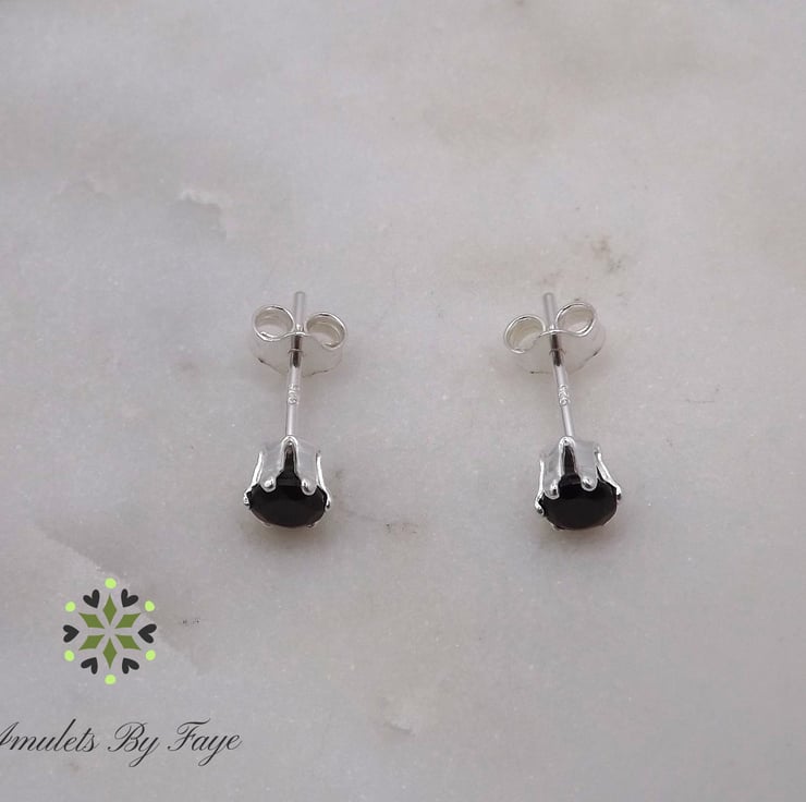 Black Spinel Facet 4mm Gemstone 6 Prong Sterling Silver Stud Earrings.