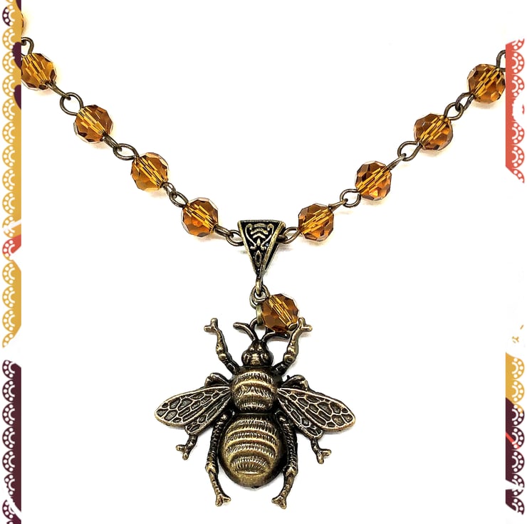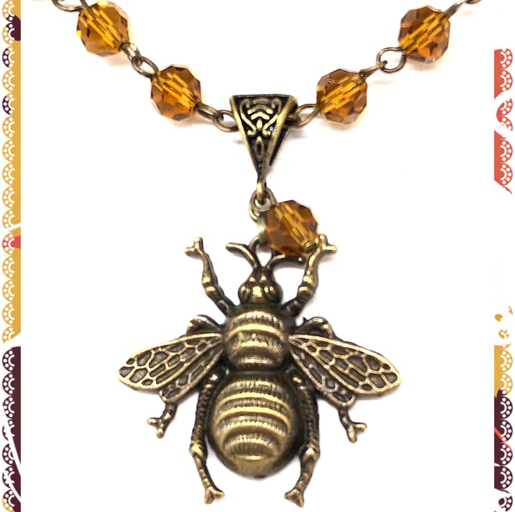 Created using this lovely bronze honeybee pendant hanging from a bronze connector, I’ve added amber coloured faceted glass beads finished with bronze rolo chain with a toggle clasp. Nickel free bronze findings.