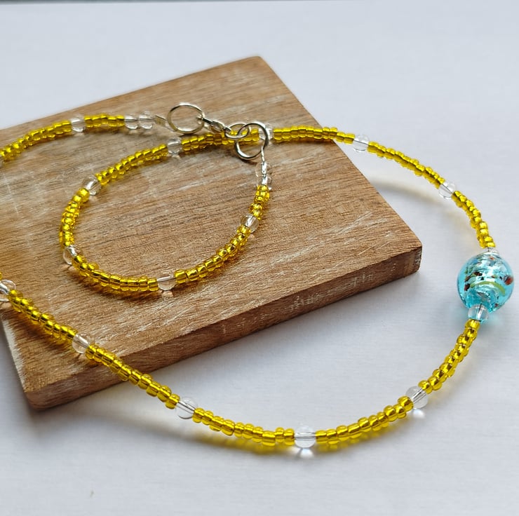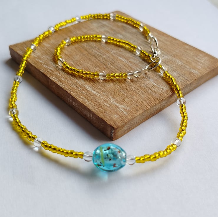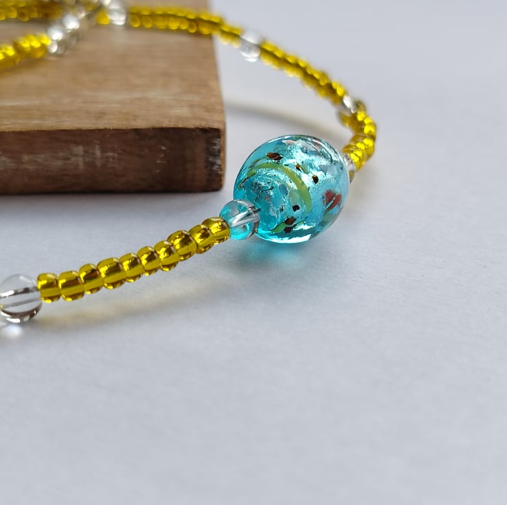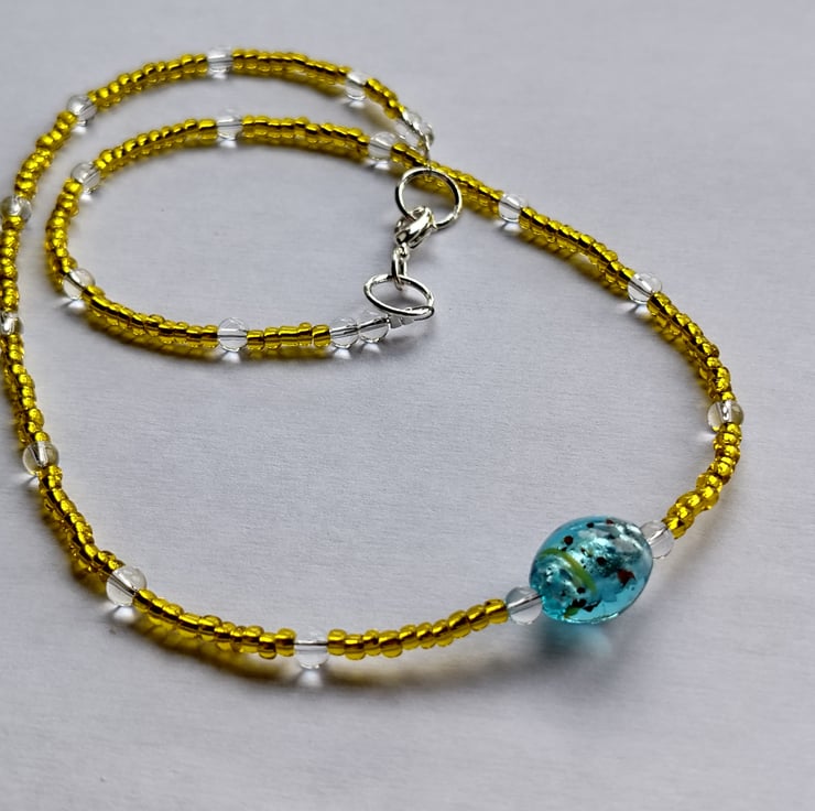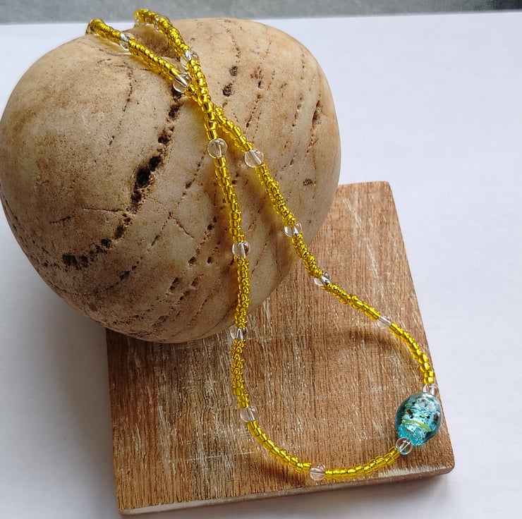 This necklace has a cool mix of colours! The lime Green seed beads are super bright and the Blue bead has a pretty contrast of colour of Yellow, Orange, Brown, White and Silver foil inside.