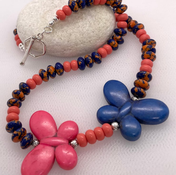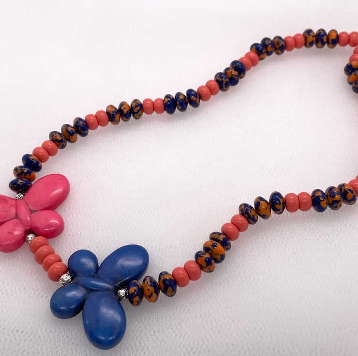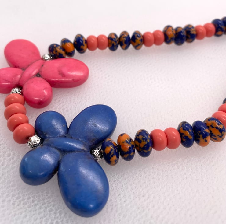 These dramatic Calsilica rondelle blue and coral beads with blue and coral butterflies make this a very eye-catching necklace. Rainbow calsilica is a new material that makes amazingly striking, eye-catching colourful gemstone beads. No two of these dramatic stones are alike - each has its own configuration of colour and striping.. The truth is that this plastic-like gemstone is pulverised carbonate rock, artificially coloured with pigments and then stabilised with a polymer.