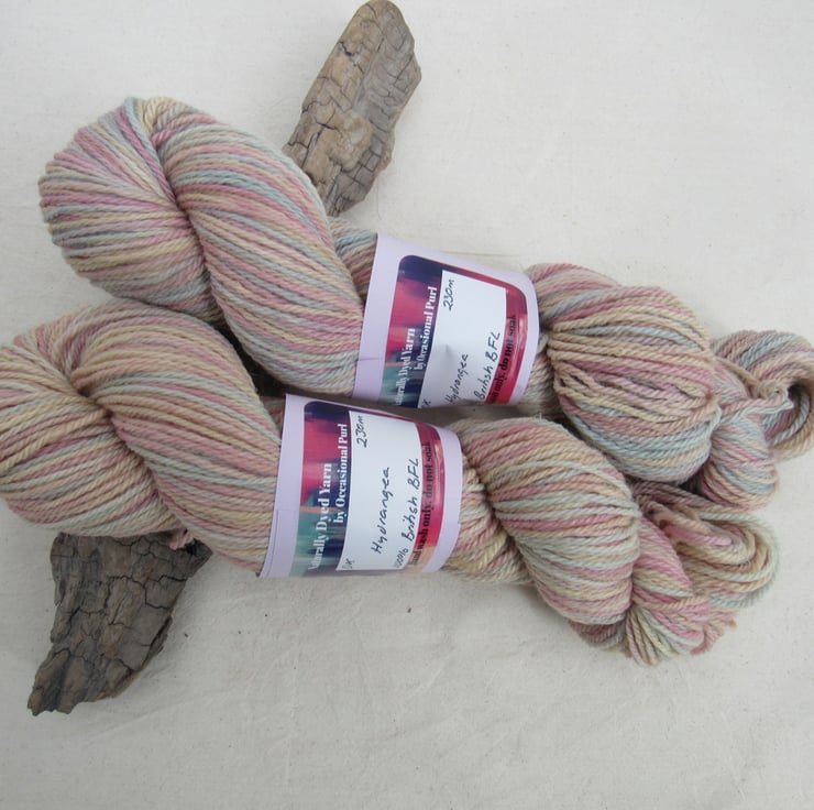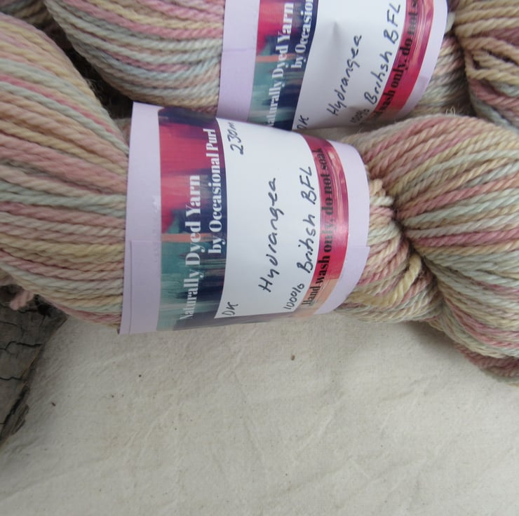 100g soft British Blue Faced Leicester double-knit weight yarn dyed with a range of natural plant dyes to give a pastel shaded pattern of pale pinks, blue and yellow