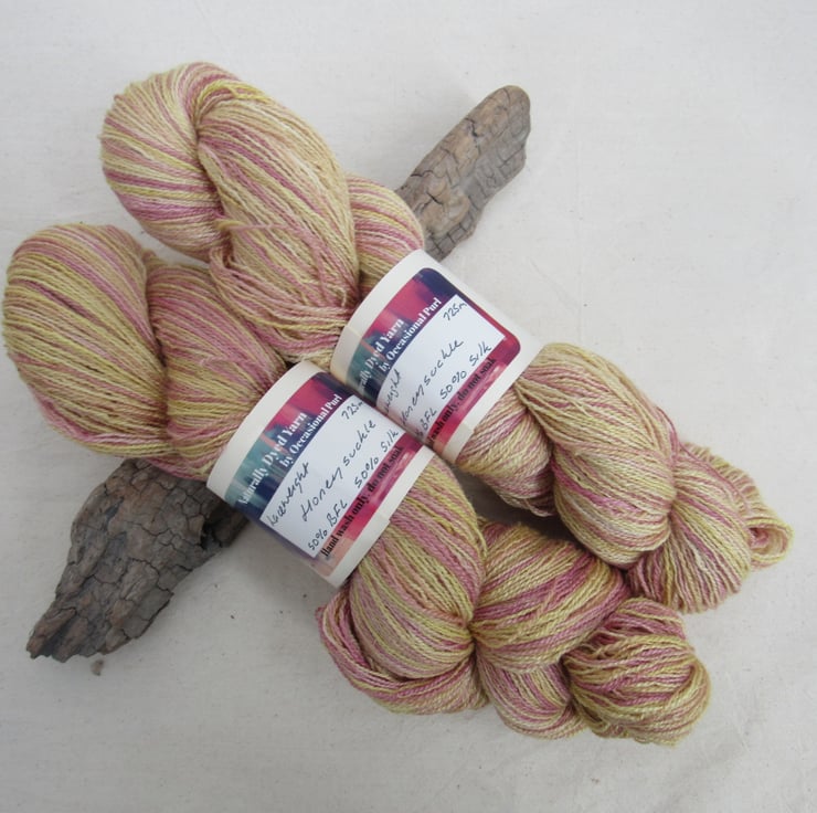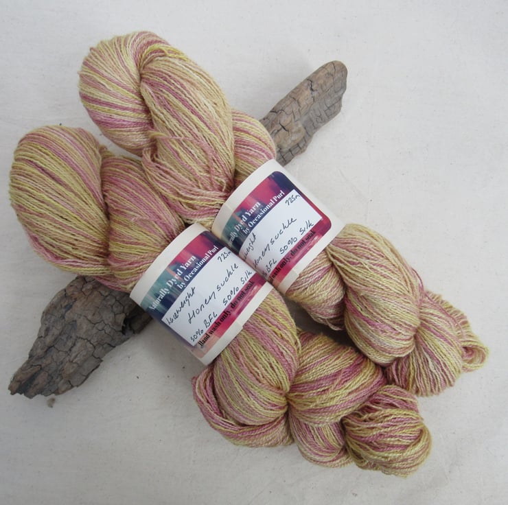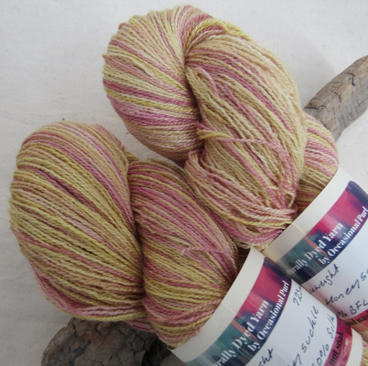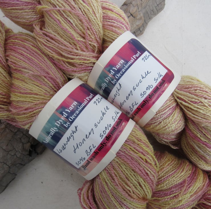 100g soft 50% British Blue Faced Leicester / 50% Silk laceweight yarn dyed with a range of natural plant dyes to give a shaded pattern of pale pink and yellow