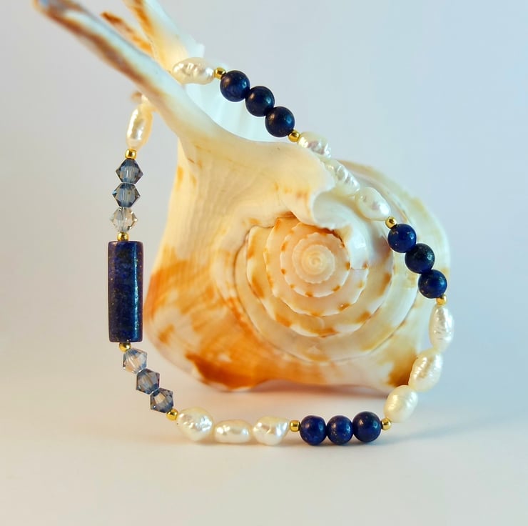 Alternating trios of, creamy-white freshwater baroque Pearls and 4mm Lapis Lazuli, separated by gold vermeil spacers, complete the circle.