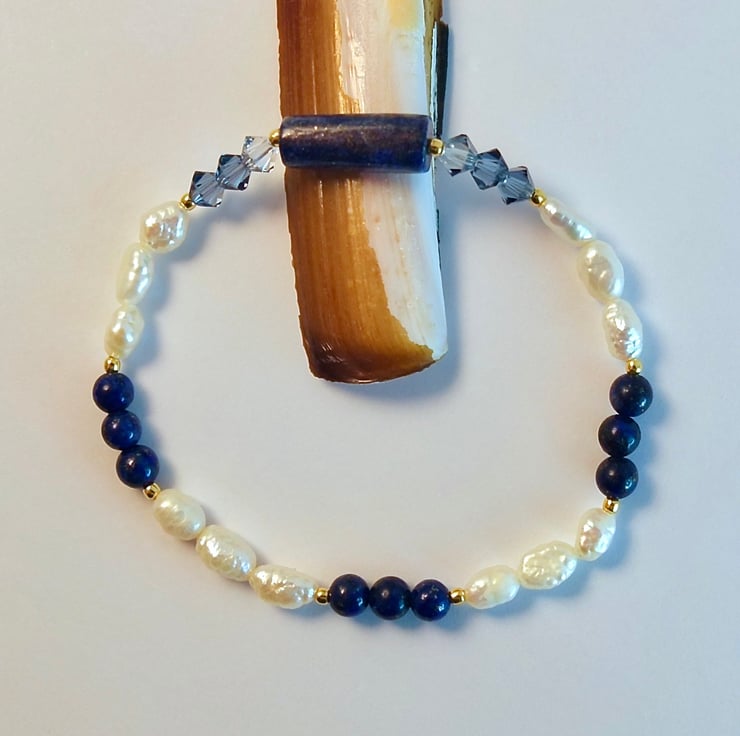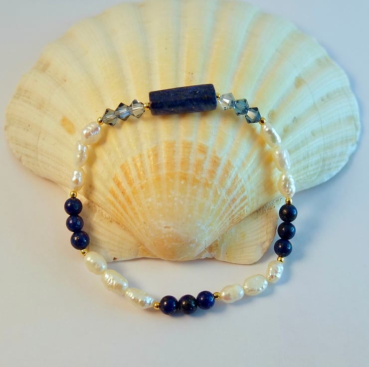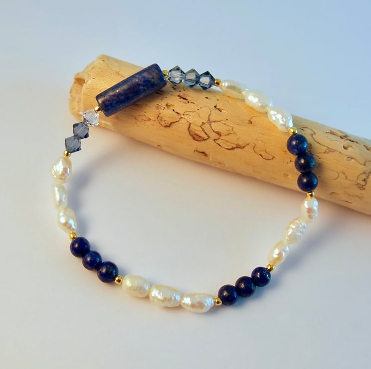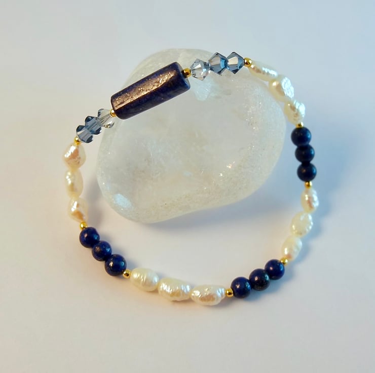 Striking stretch bracelet featuring a 6x15mm Lapis Lazuli tube flanked on either side by a trio of sparkly Austrian 'denim' and 'blue shade' crystals ,highlighted with tiny 1.8mm gold vermeil spacers.
