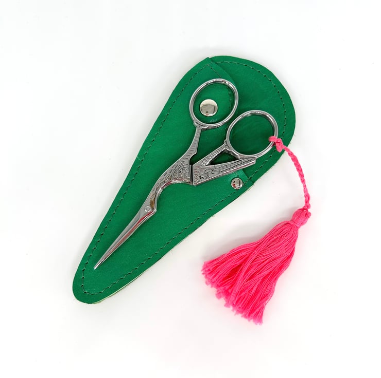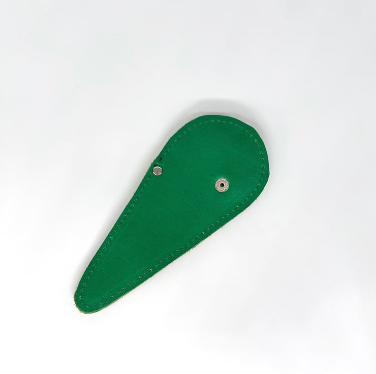 This green real leather scissor case has been especially made to hold embroidery scissors and other small scissors. The soft leather will keep your scissors safe and protected. Perfect for scissors no larger than 11.5 cms long.