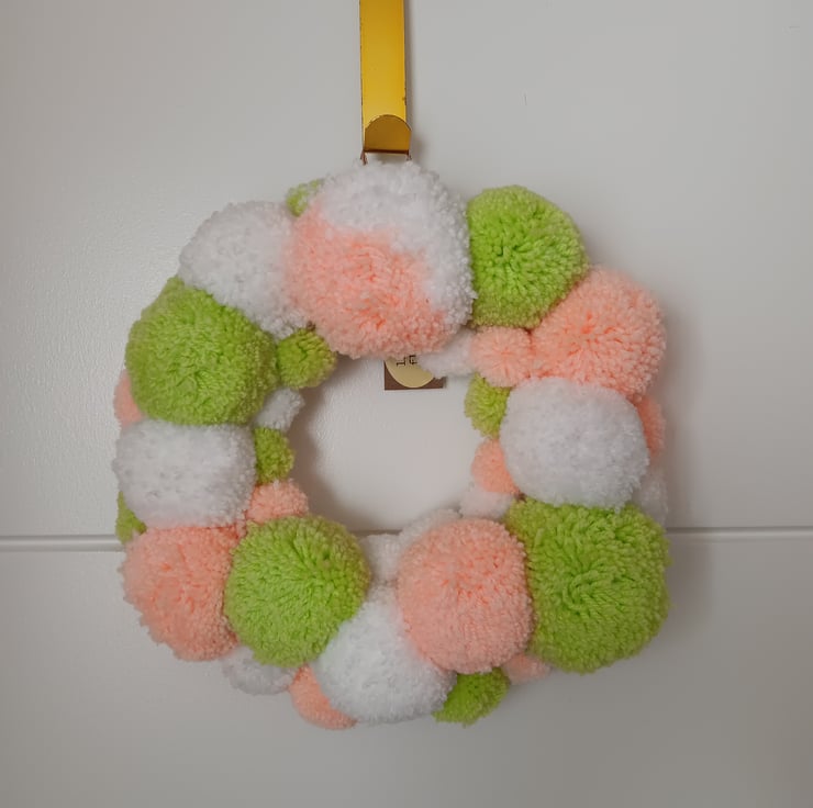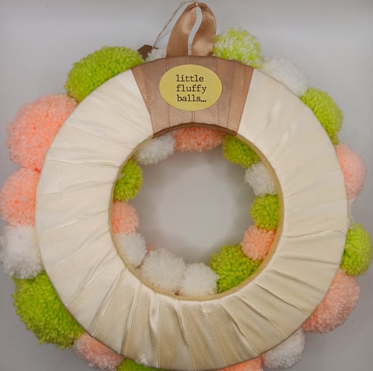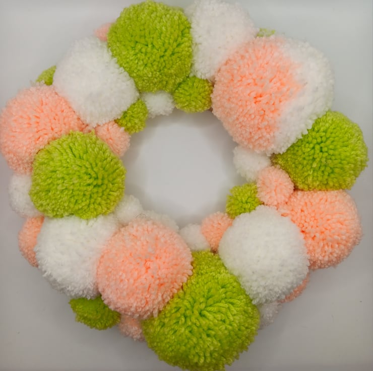 Pom pom hanging wreath approximately 30cms diameter , and around 10cm in depth made from polystyrene and wool, for indoor use only. Free postage .