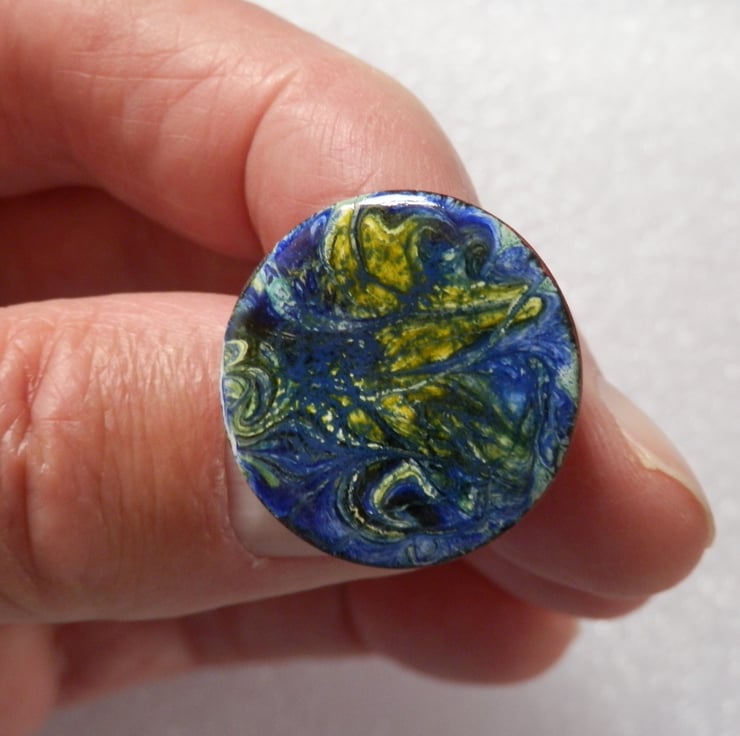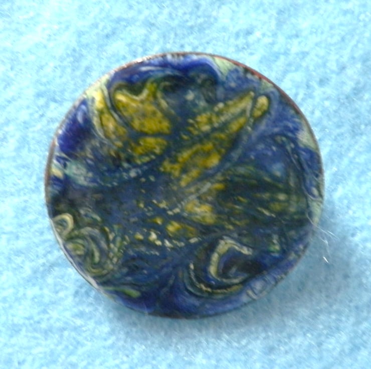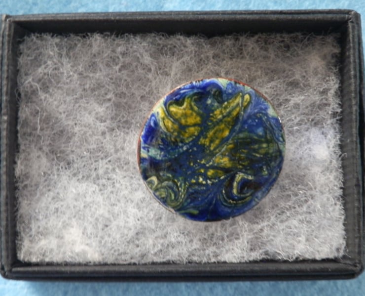 his brooch is a simple white enamel disc decorated with a scrolled pattern in yellow and blue.