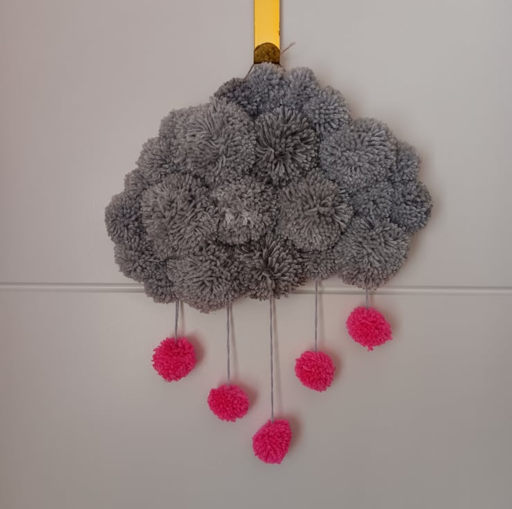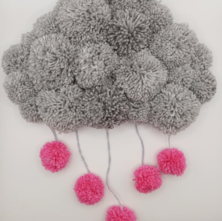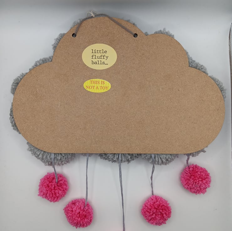 Pom pom hanging cloud approximately 34cms across, 40cm legth and 8cm depth made from mdf and wool, for indoor use only. Free postage .
