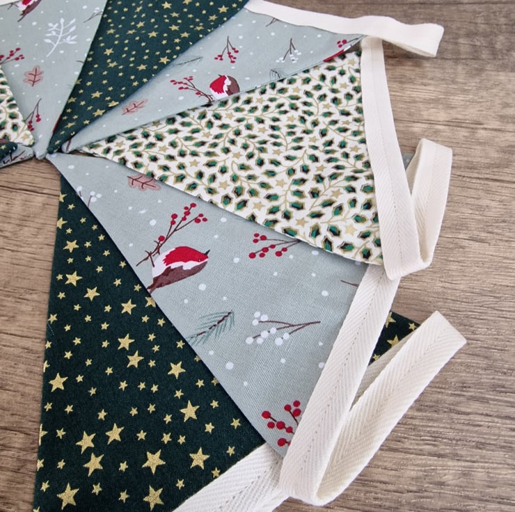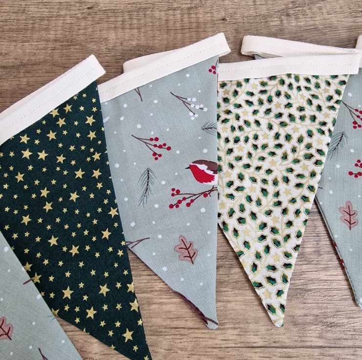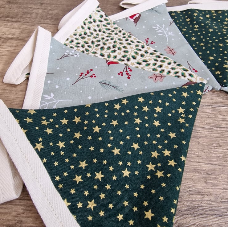 This green, duck egg blue & ivory Christmas bunting has 9 double sided fabric flags, and is perfect for decorating any wall or fireplace. The fabrics have designs including traditional Robins, stars and holly, and have a little bit of gold on them.