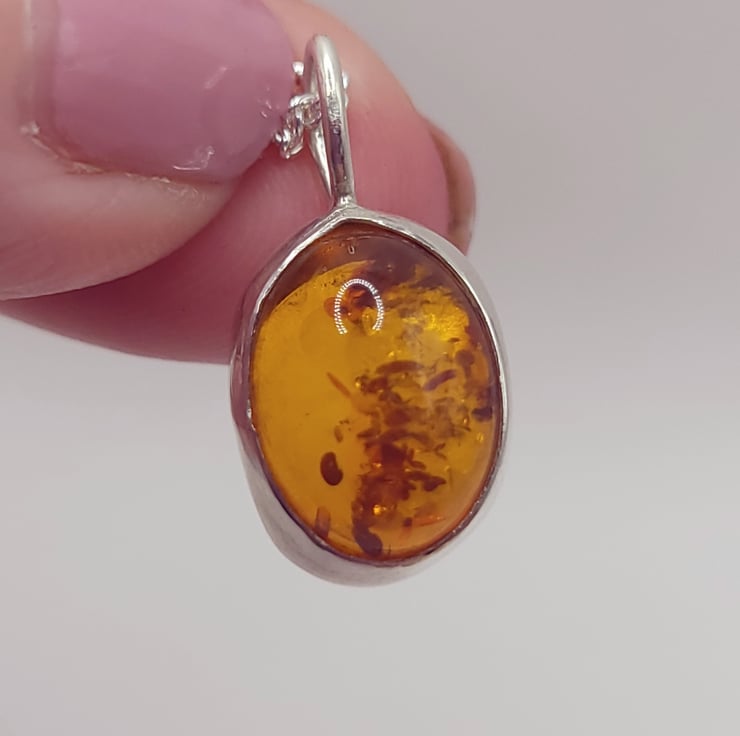 Set in a sterling silver bezel cup that has a matching shape handpierced on the reverse. This allows the light to shine through and highlight the natural inclusions in the Amber.