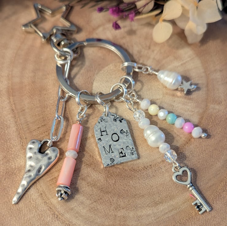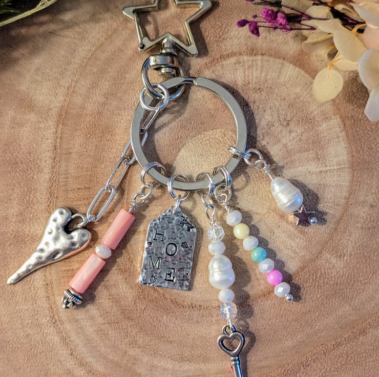 The key chain is then finished with a hammered heart charm, four pretty drops, one with a freshwater pearl and star bead, the next with a freshwater pearl and sparkly white beads with a key charm and the third with sparkly white beads and tiny mother of pearl pastel coloured beads and the last with pink shell tube beads and a white sparkly bead.