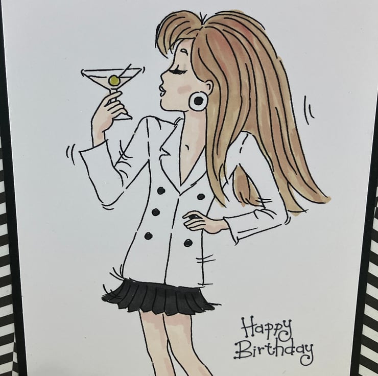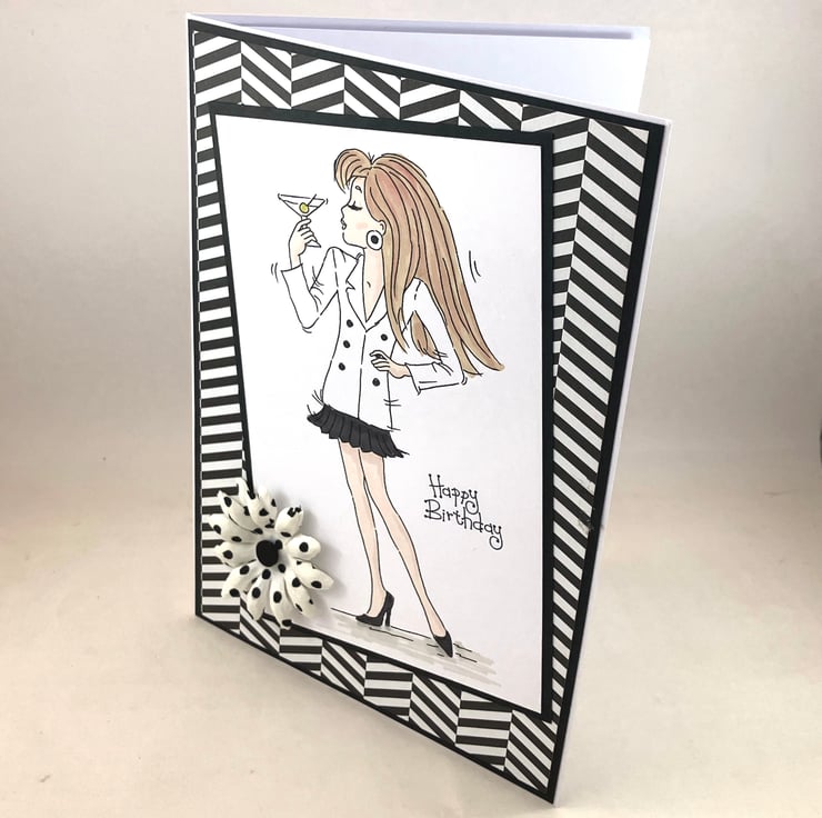A5 sized birthday card featuring a hand coloured image of a girl dressed in a pleated skirt and white jacket drinking a cocktail. The image has the sentiment 'Happy Birthday' printed alongside and is mounted on black card, over a black and white patterned background. The card has been embellished with black and white polka dot flowers with a black button centre.