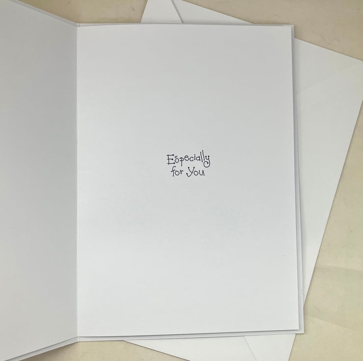 The card measures approximately 15cm x 21 cm (6 inches x 8 inches) and comes in a sealed wrapper, together with a white envelope.