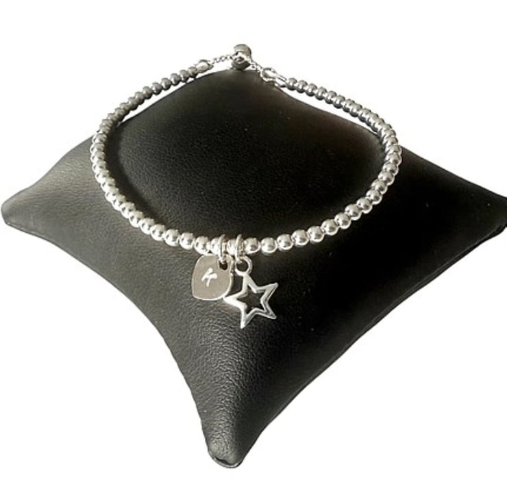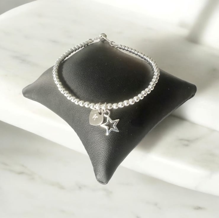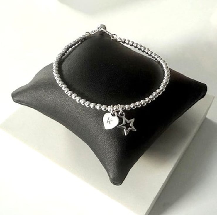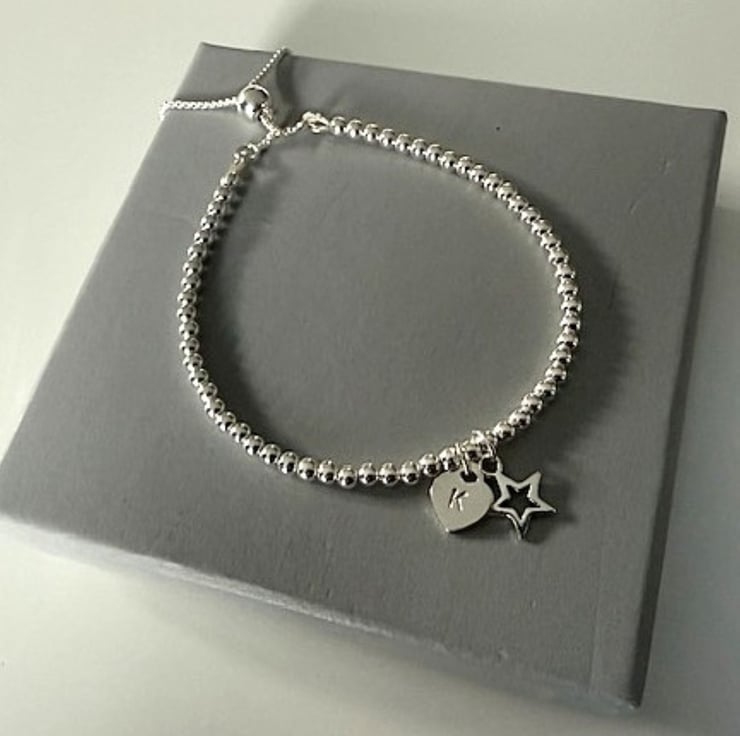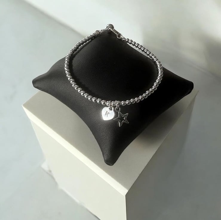 A delicate and meaningful bracelet handcrafted with 3mm sterling silver beads, featuring two symbolic charms: an open star and a heart, which can be personalised with a hand-stamped initial of your choice.