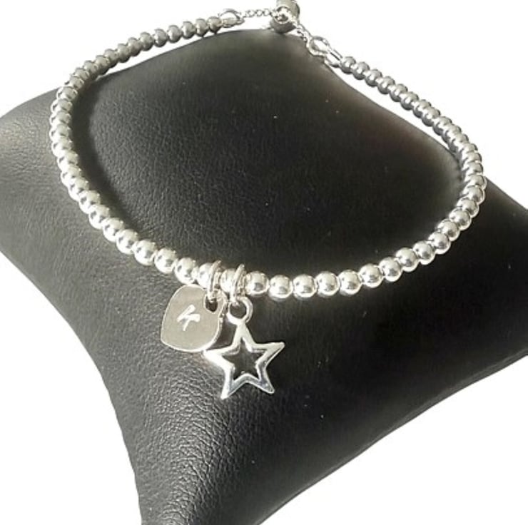 Sterling Silver Bead Bracelet with Personalised Heart & Open Star Charm – Handmade & Adjustable