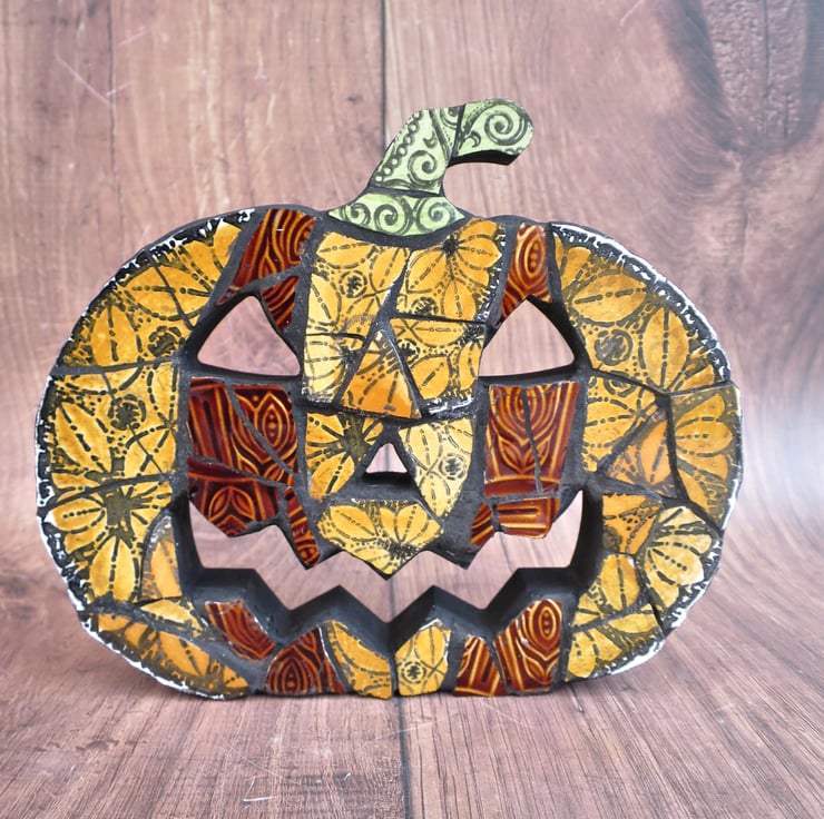 A quirky pumpkin full of autumn colour, vintage texture, and handmade magic. A little bit spooky, a little bit special.