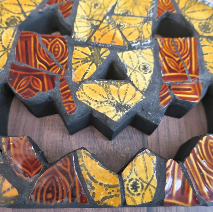 This cheerful mosaic pumpkin is handcrafted using pieces of vintage patterned china – including bold designs from Kathie Winkle’s Tashkent and classic Tams plates. The result is a characterful little Jack O’ Lantern with a warm, rustic twist and a story to tell.