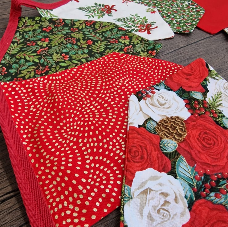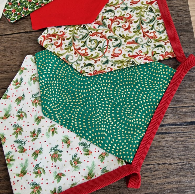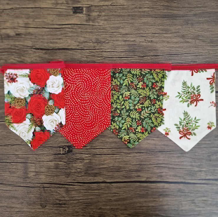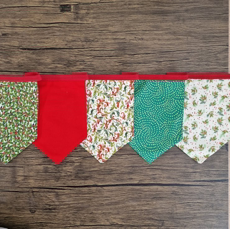 This traditional Christmas fireplace bunting comes in a standard length of 1.8 metres (plus a little extra for hanging), and incorporates 9 double sided pennants. Each pennant is 19cm long and 13.5cm wide. You can purchase this item with a gold coloured "jingle bell" sewn on to each pennant.