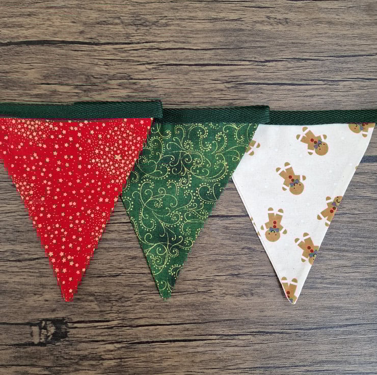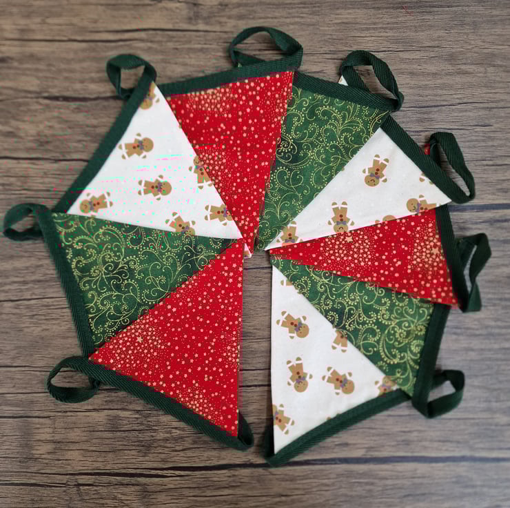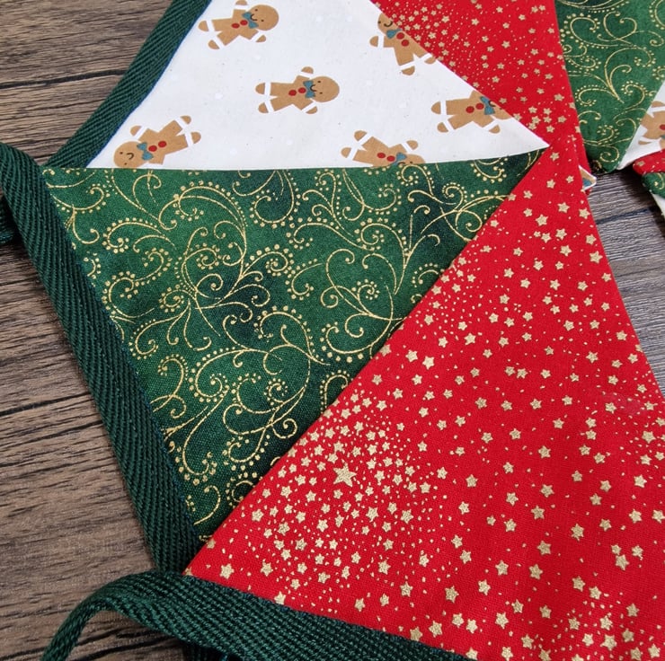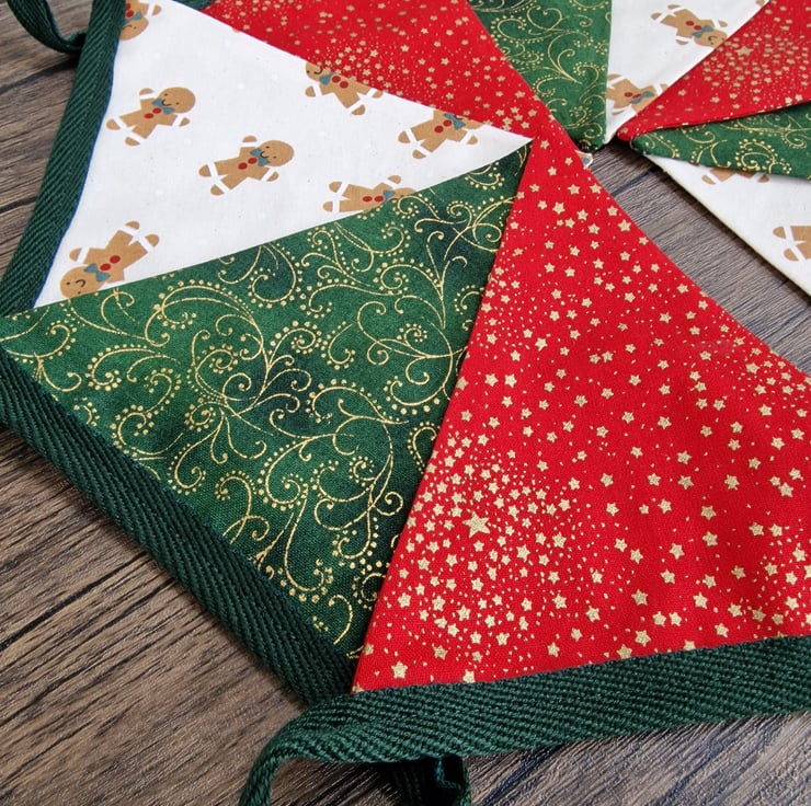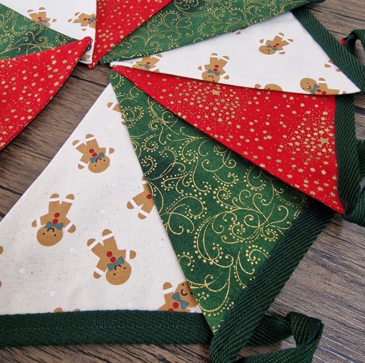 This traditional Christmas bunting is made with traditional red & green fabrics alongside a gingerbread man patterned print. The green & red fabrics have gold stars and scrolls patterns, giving the fabrics a wonderfully luxurious feel. The bunting is finished off with a dark green tape.