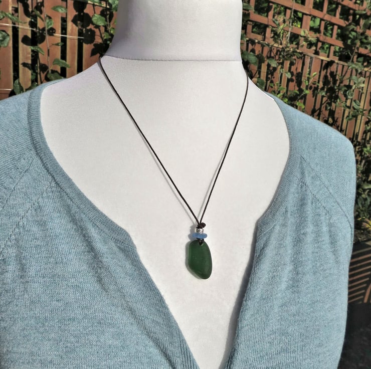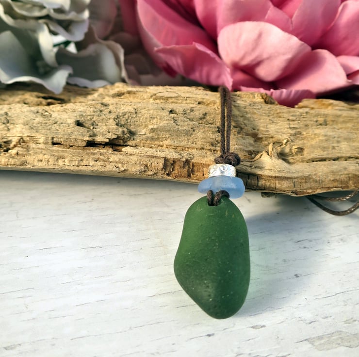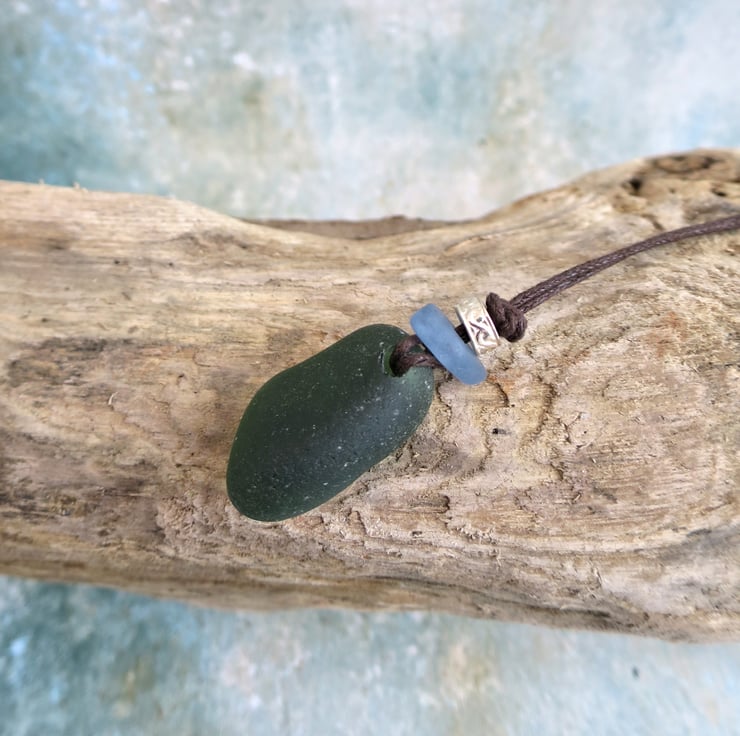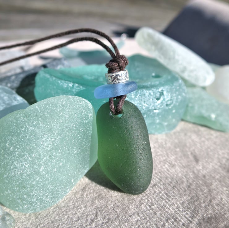 Green and Blue Sea Glass Pendant, Unisex Coastal Necklace on Cotton Cord