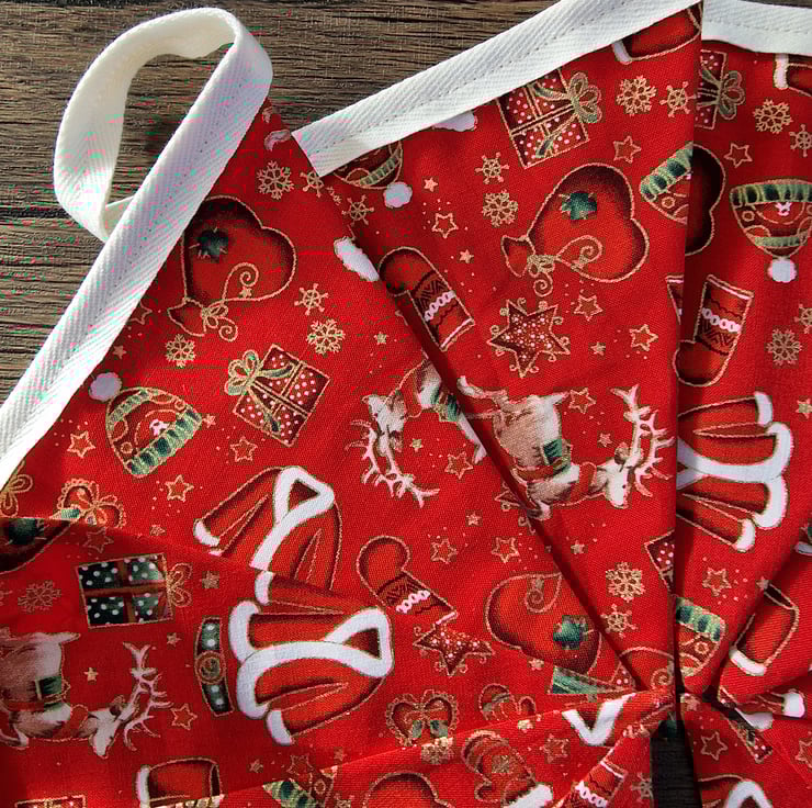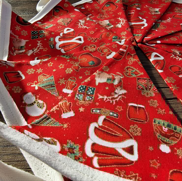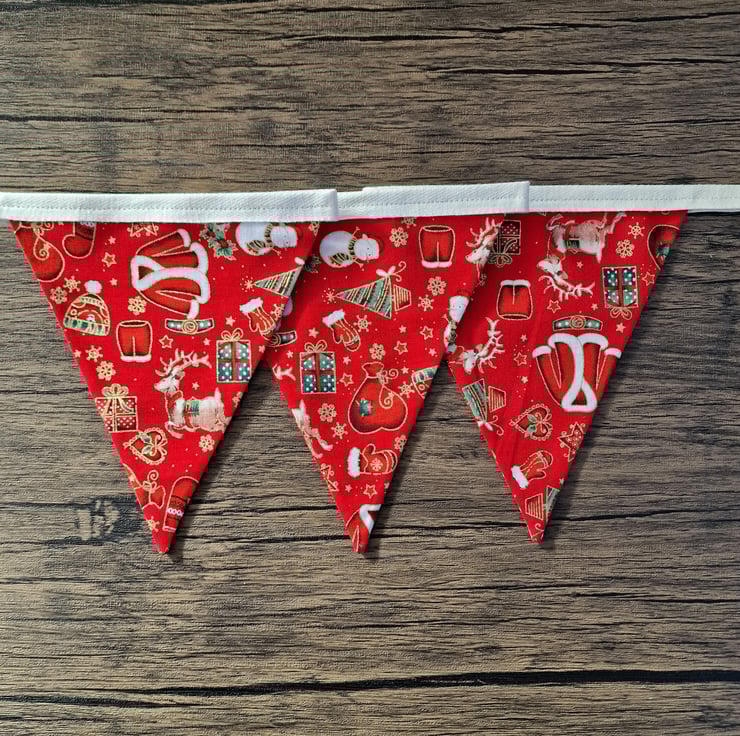 This Christmas bunting is made with a red colour fabric with images of Christmas presents, Santa's sack, Reindeers, glove and hats. The images are edged in gold, giving the fabric a wonderfully luxurious feel. The bunting is finished off with an ivory tape.