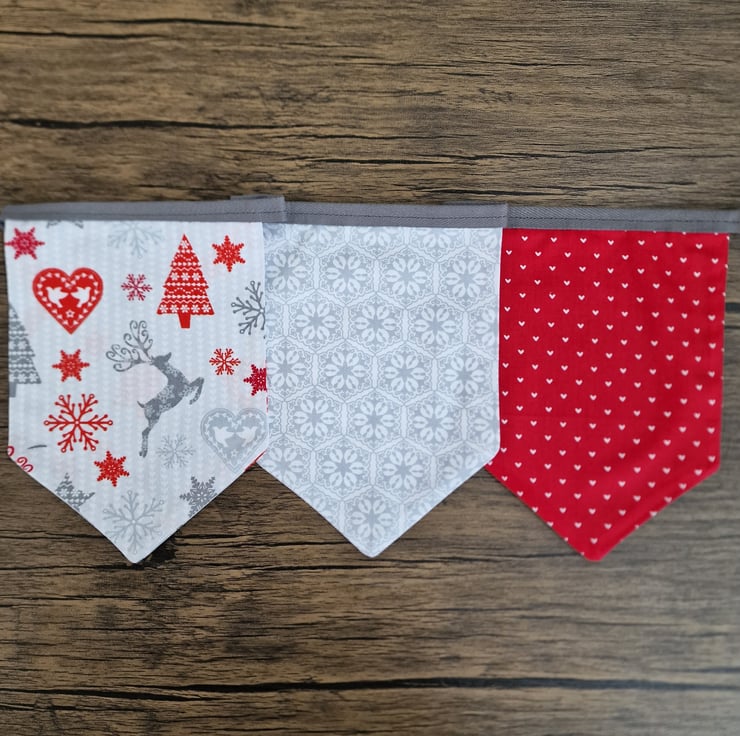 This Christmas bunting comes in a standard length of 1.4 metre and incorporates 6 double sided pennants. Each pennant is 19cm long and 13.5cm wide. You can also purchase this item with a silver coloured "jingle bell" sewn on to each pennant.