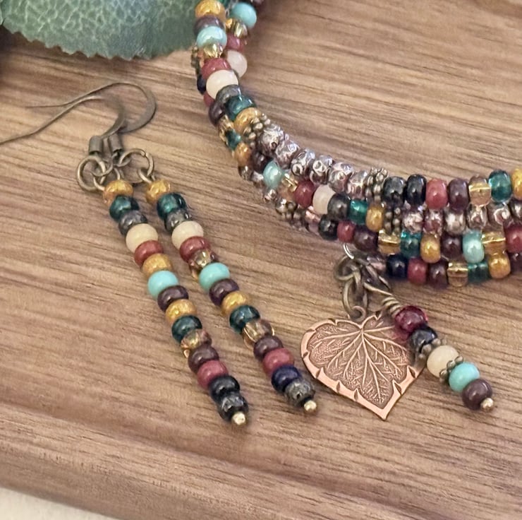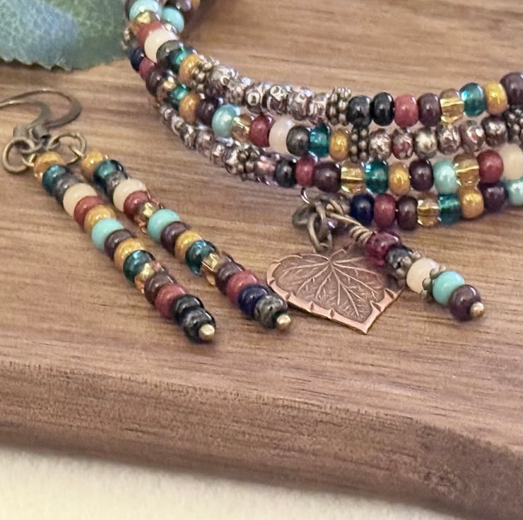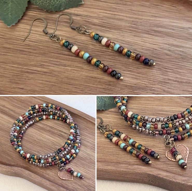 This vibrant handmade jewellery set featuring a multi-strand beaded bracelet and matching earrings.