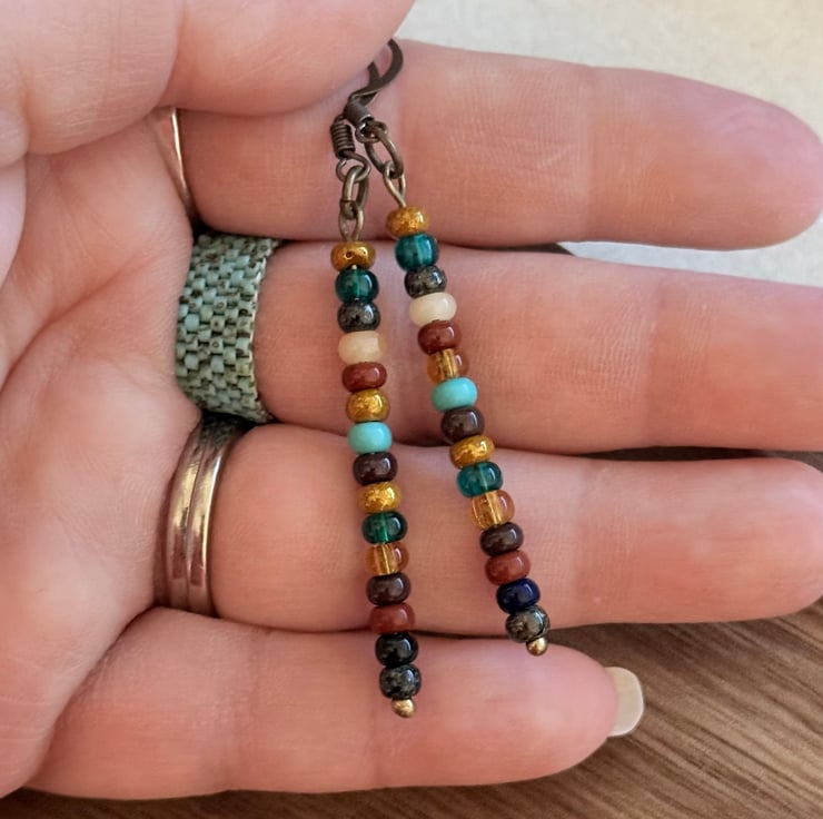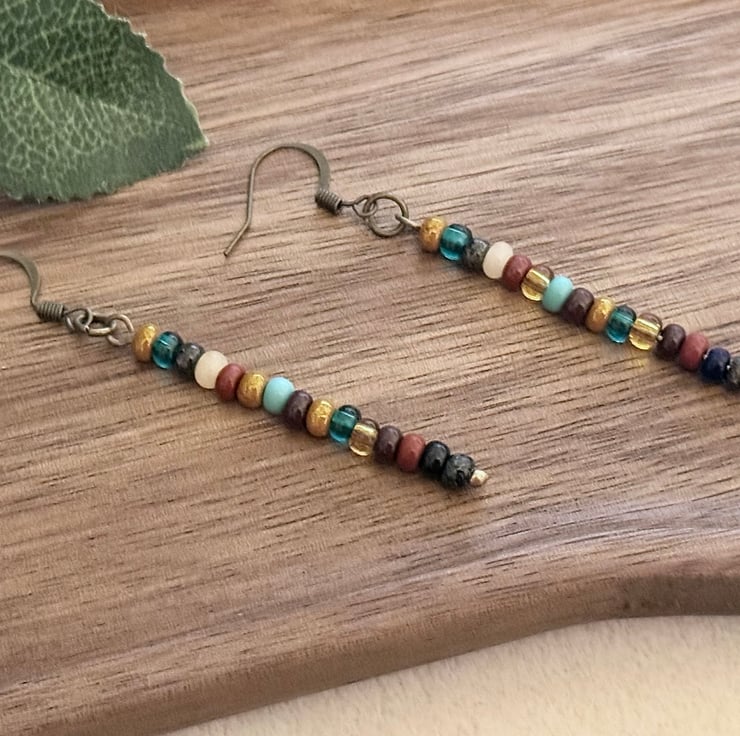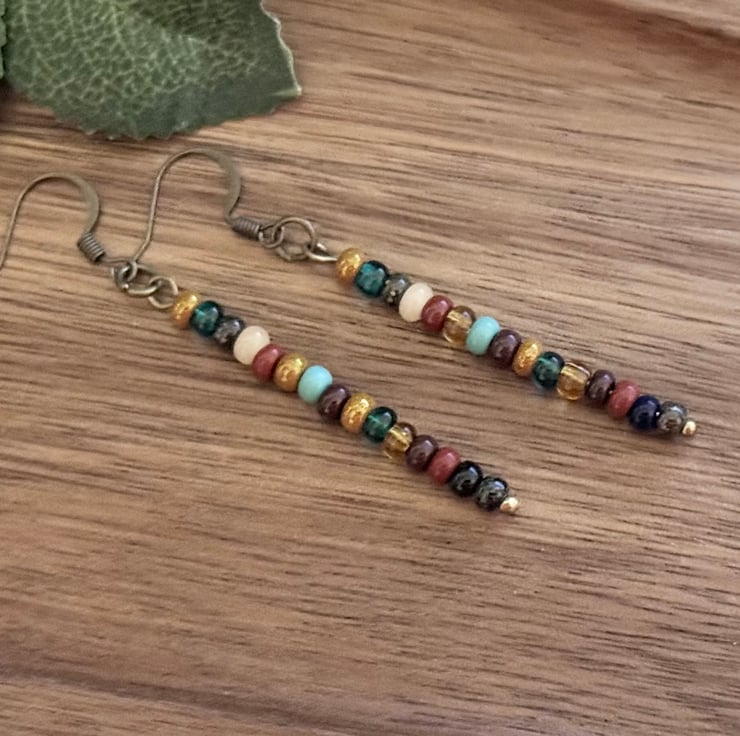 The earrings, made with the same seed beads on bronze-tone pins, measure 6.5 cm long and dangle from matching ear wires.