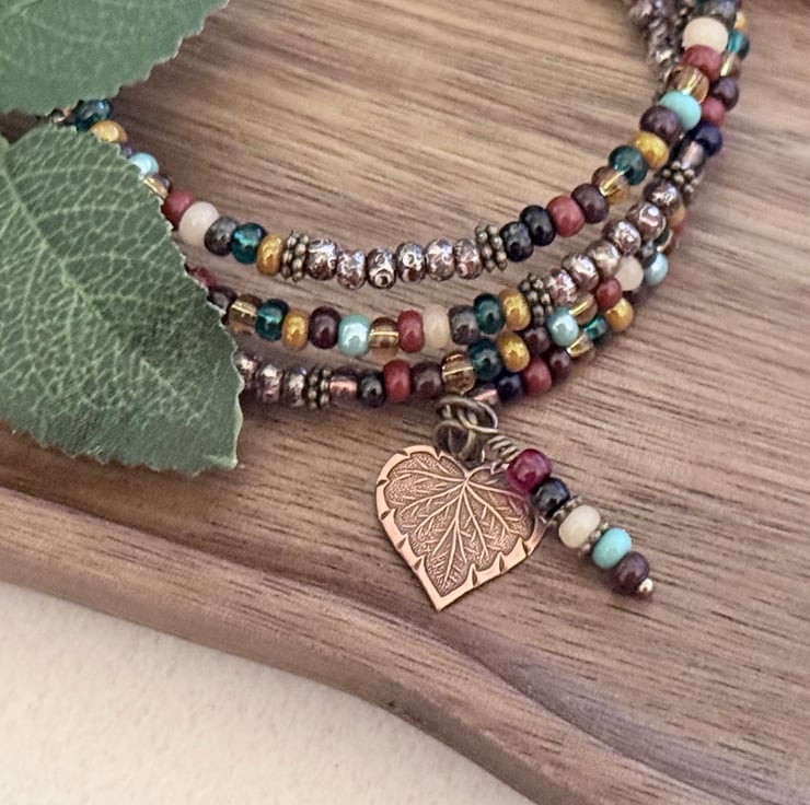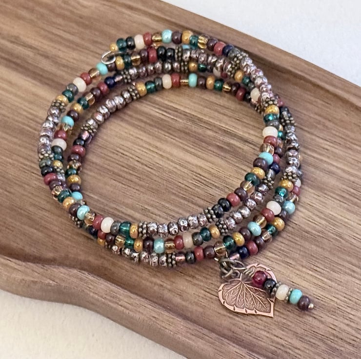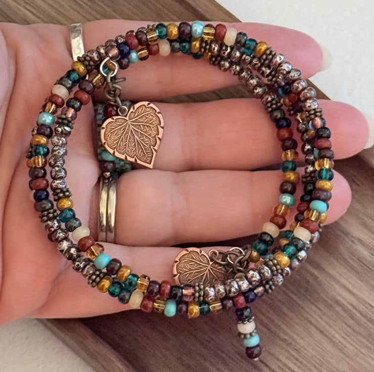 The bracelet consists of 3.5 loops of memory wire and finished with handmade charms fashioned from more seed beads and embossed bronze leaf charms.