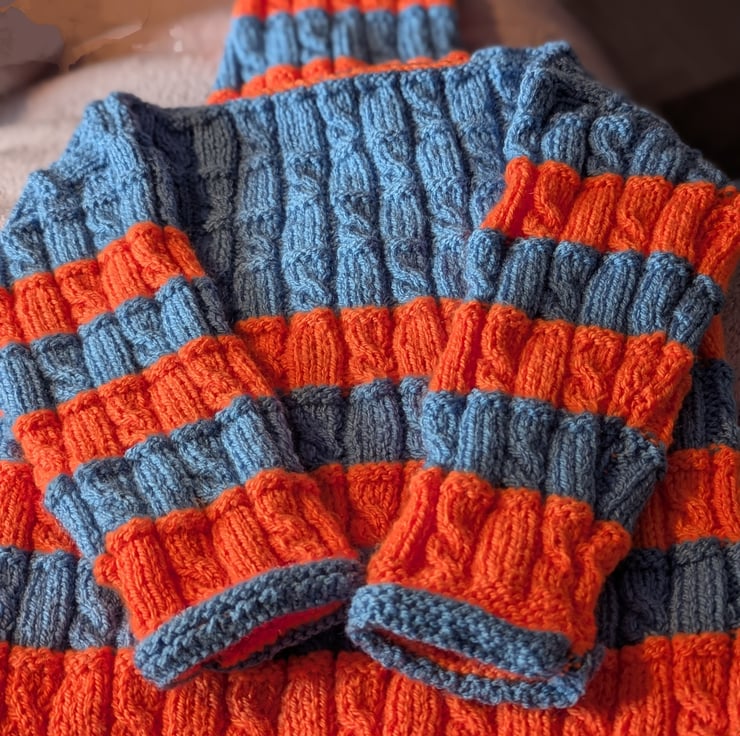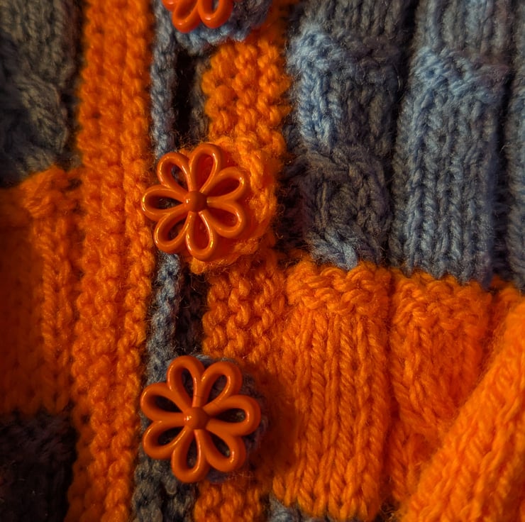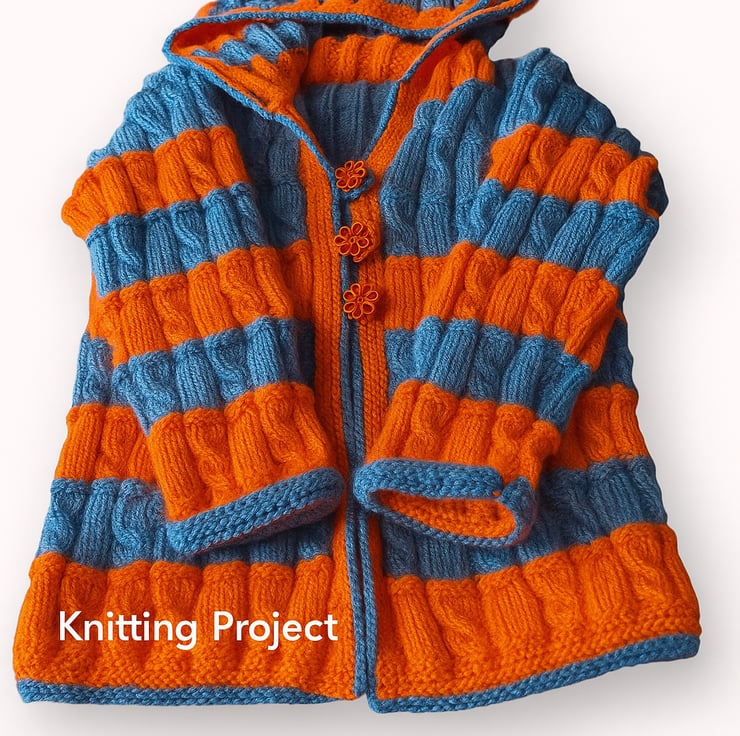This season's colours for kids, Cobalt blue and zingy orange, knitted up into this fabulous coatigan in a geometric pattern. It has two front pockets, a hood, long sleeves and cute flower buttons with knitted loops instead of button holes.