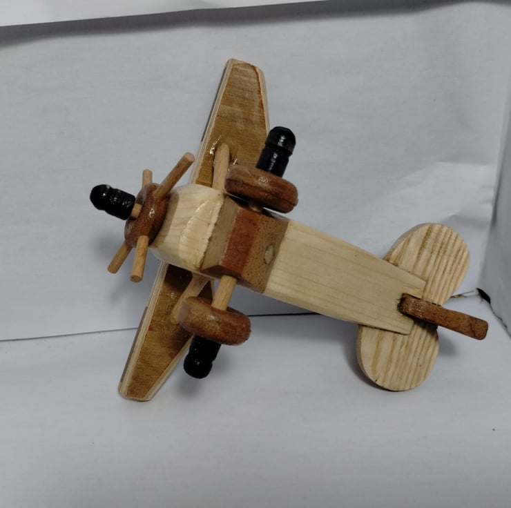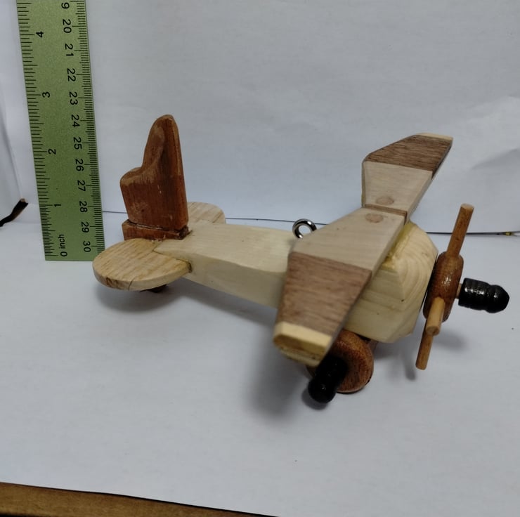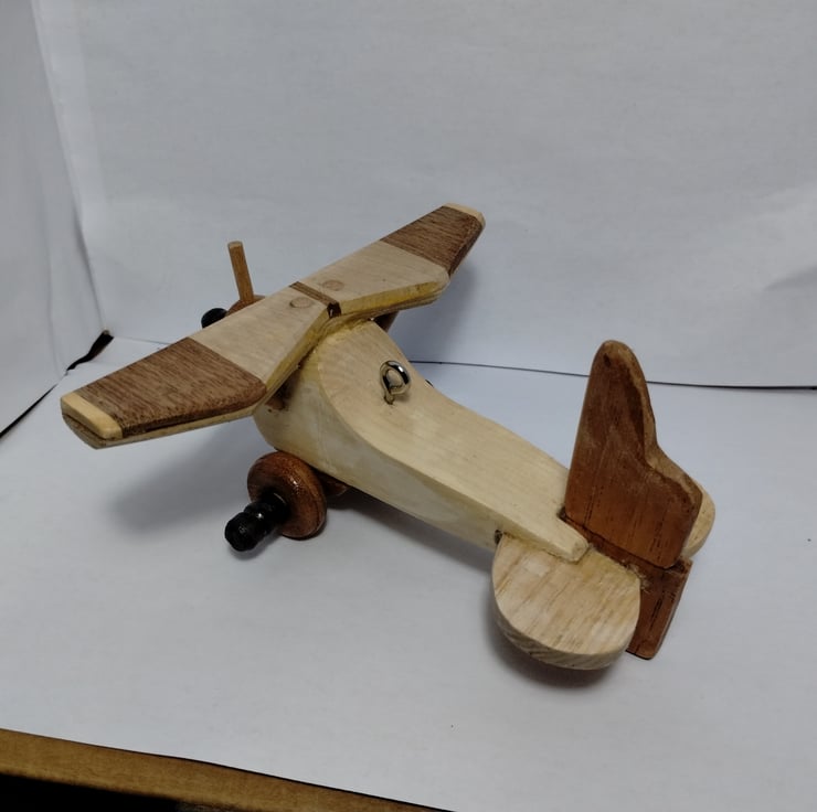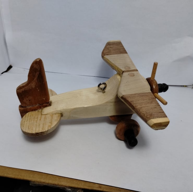 I made some bowls with different woods glued together a few years ago and decided to saw through the left overs and they seemed ideal to make a decorated wing for a plane, so it seemed sensible to glue the slithers to a piece of plywood for strength and voila a nice bi plane. (I almost made them into a hanging mobile but it seems a bit too big for that?)