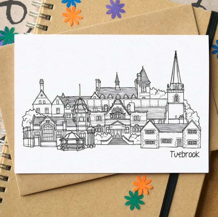 A blank card featuring a skyline illustration of some of the Liverpool district of Tuebrook's most iconic landmarks.