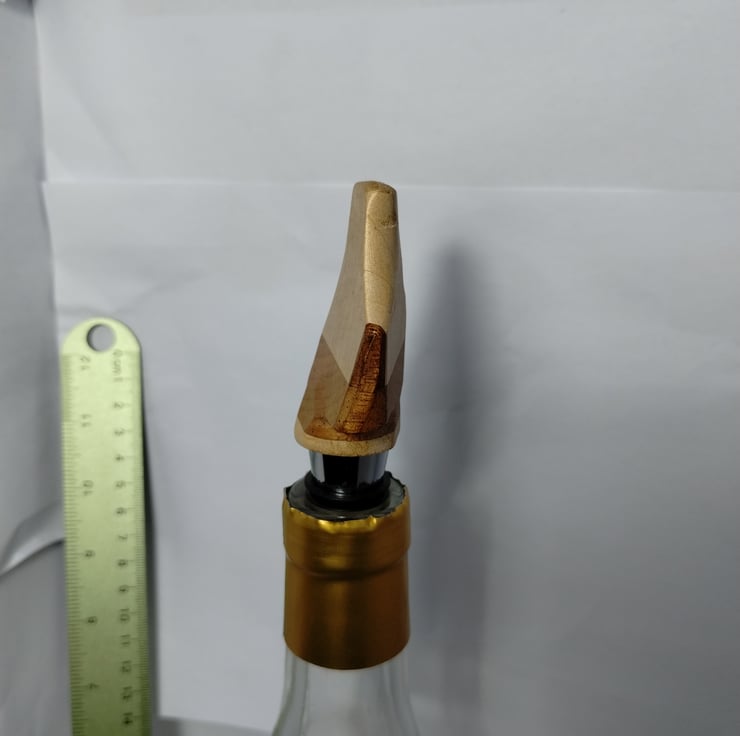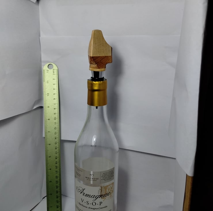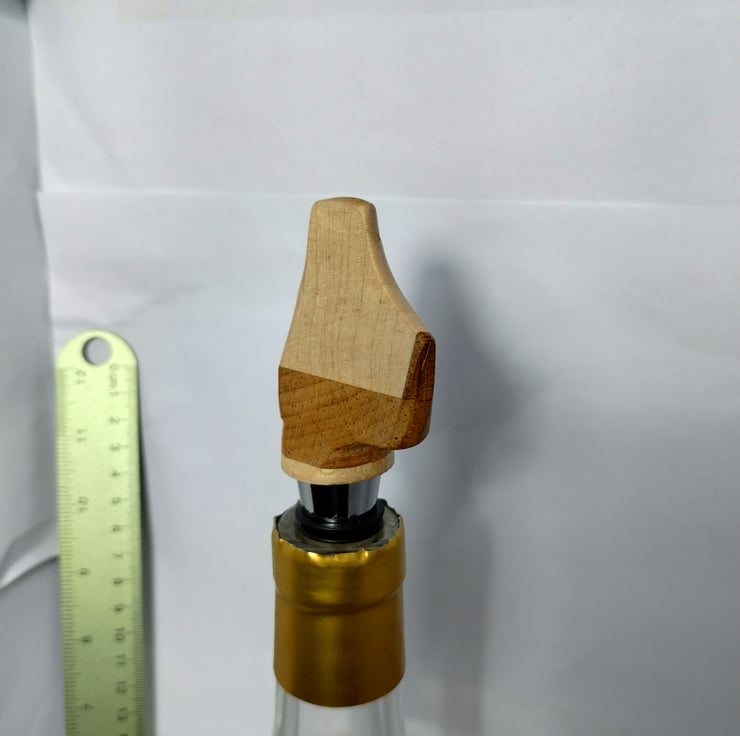a bottle stopper with a wooden top I made to fit on a factory made base with a special silicone bung to fit a standard wine bottle, making a unique, bespoke decorative wine stopper.