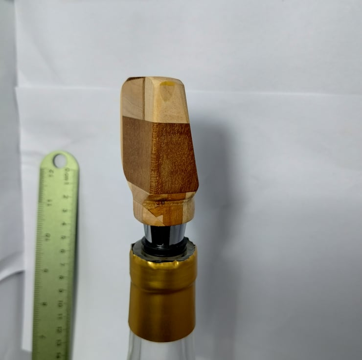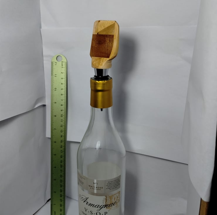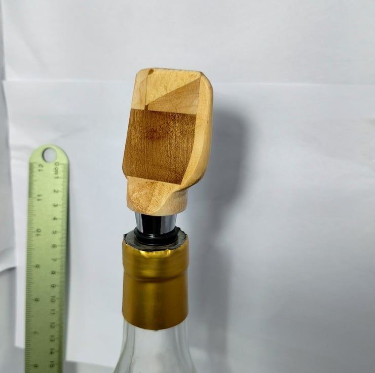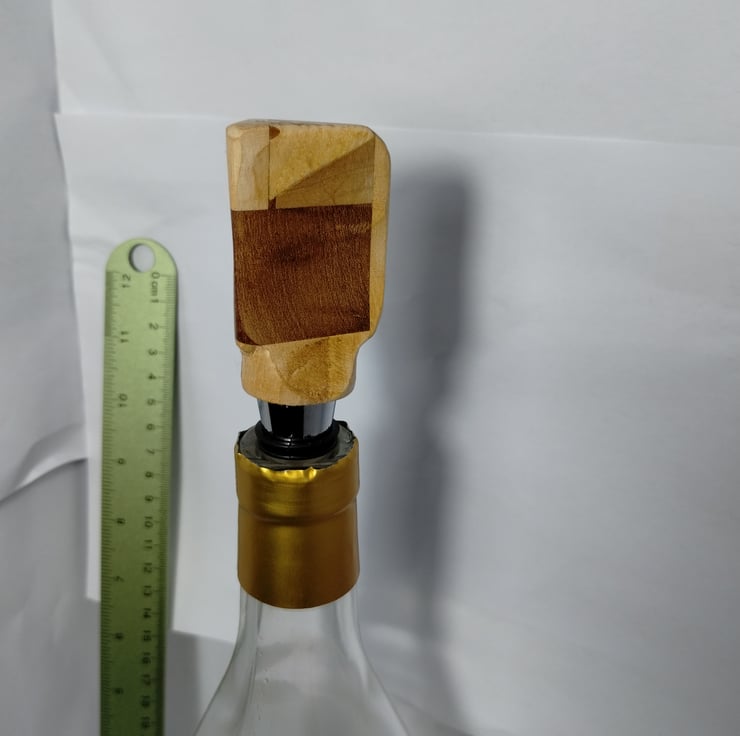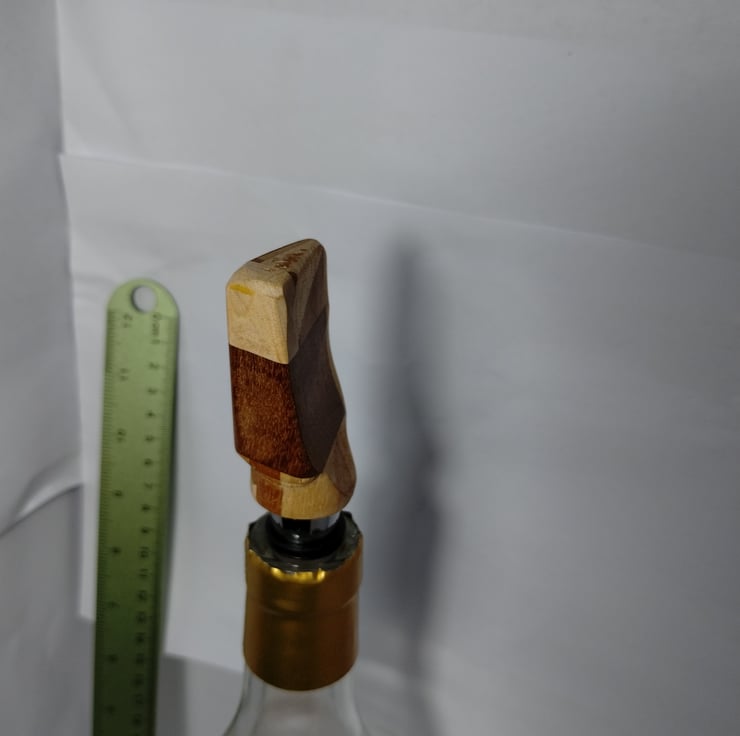 a bottle stopper with a wooden top I made to fit on a factory made base with a special silicone bung to fit a standard wine bottle, making a unique, bespoke decorative wine stopper.