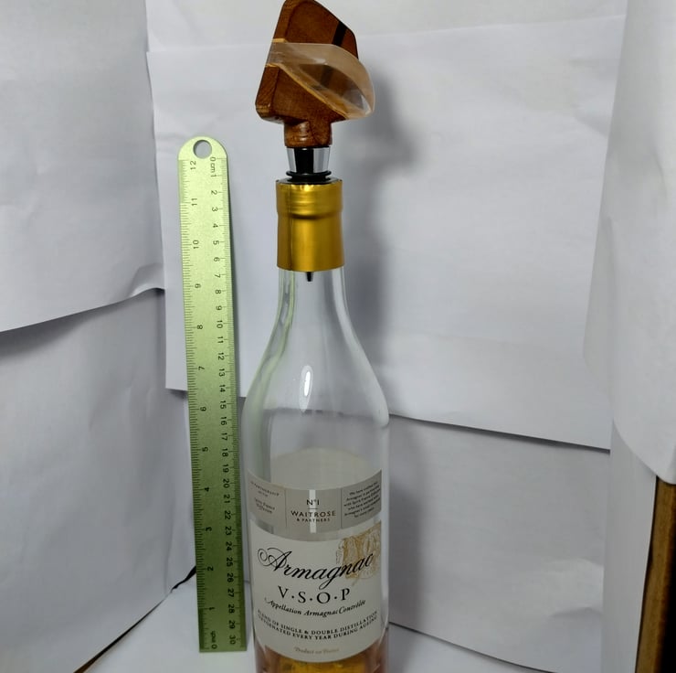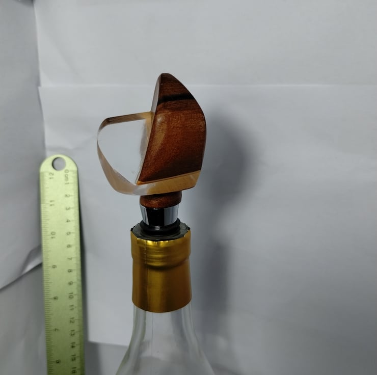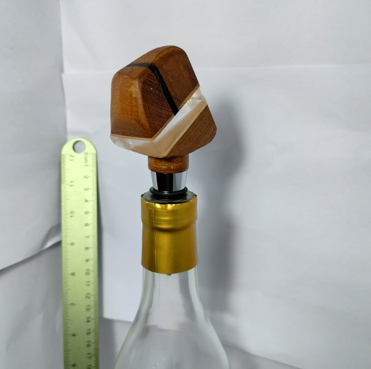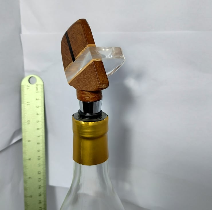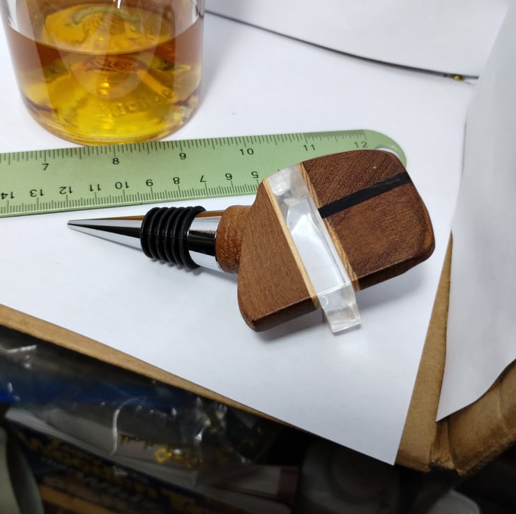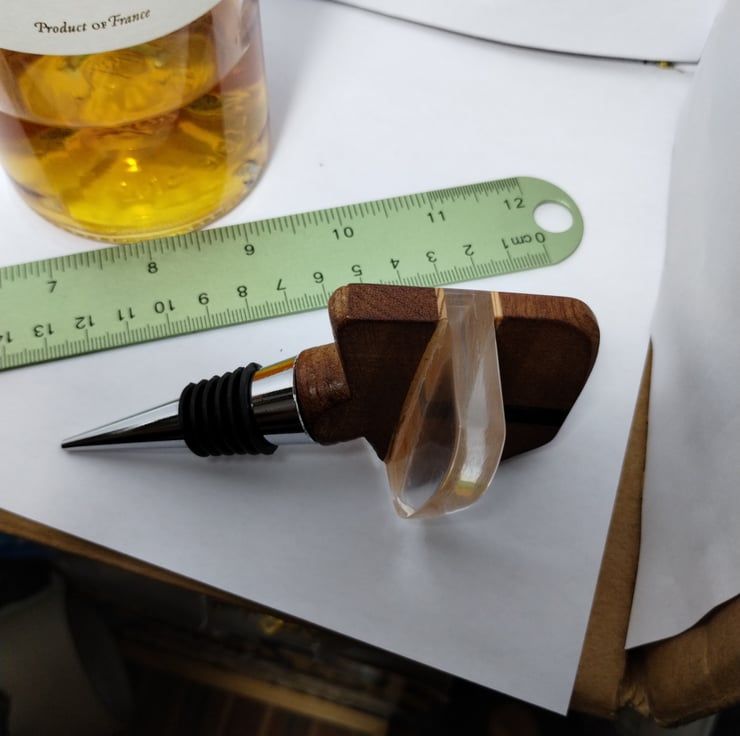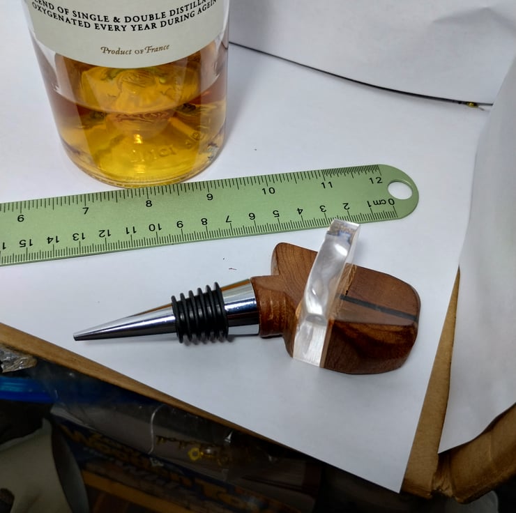 a bottle stopper with a wooden top I made to fit on a factory made base with a special silicone bung to fit a standard wine bottle, making a unique, bespoke decorative wine stopper.