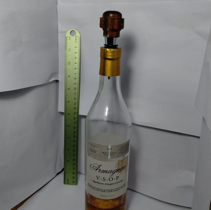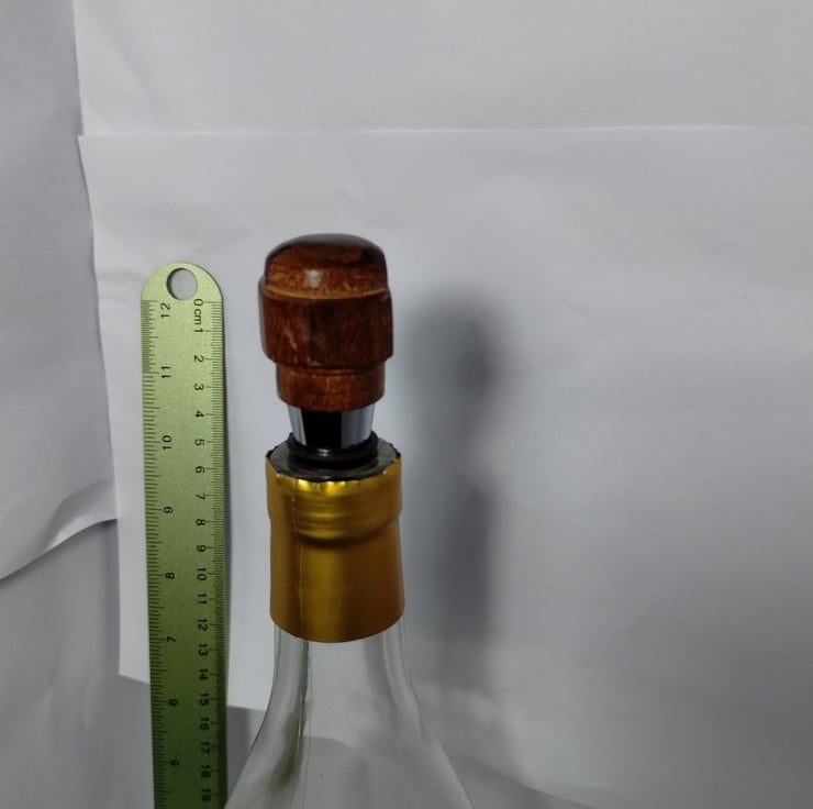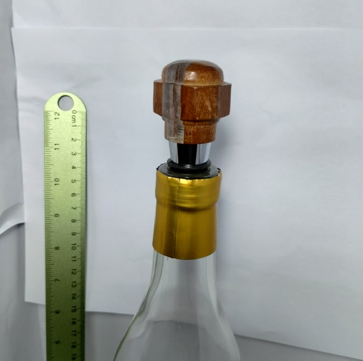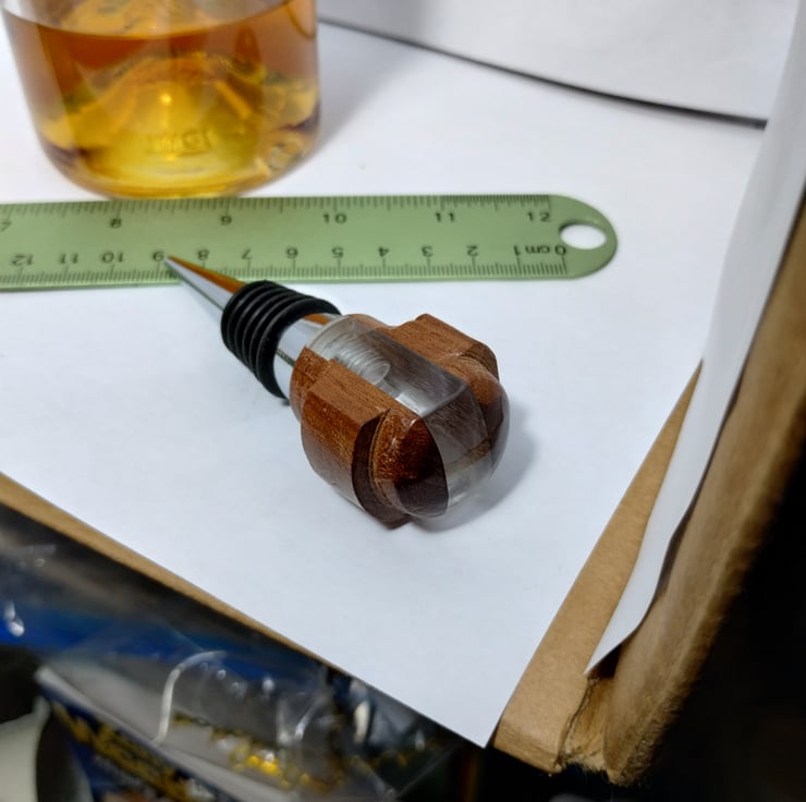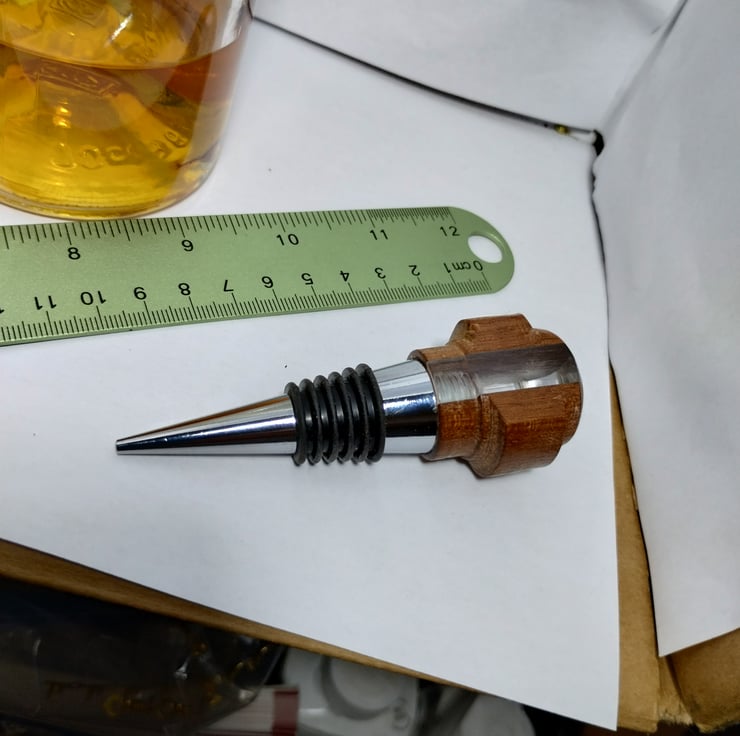 a bottle stopper with a wooden top I made to fit on a factory made base with a special silicone bung to fit a standard wine bottle, making a unique, bespoke decorative wine stopper.
