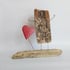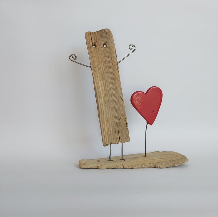 "Happy Again" is a unique driftwood figure, featuring a small wire nose and a delicate wooden heart.