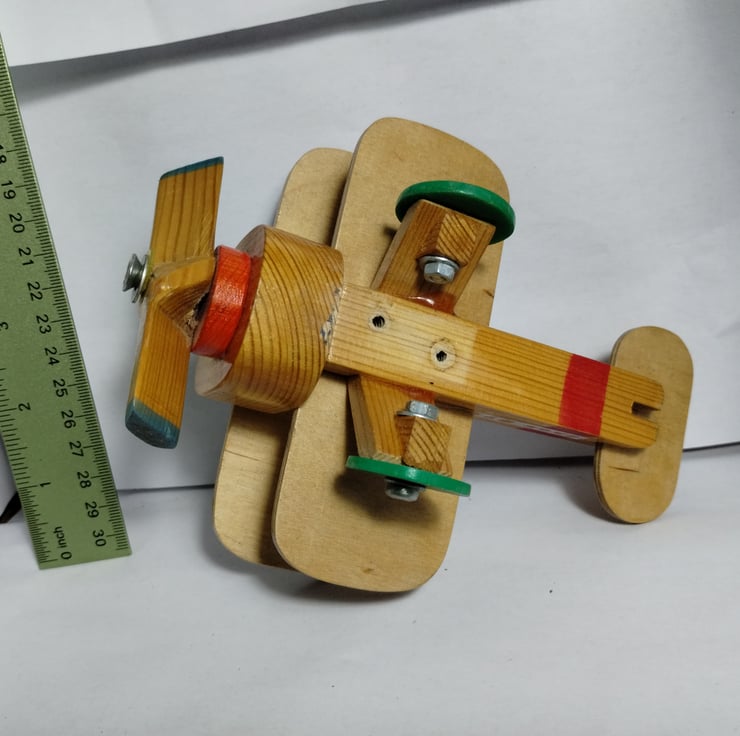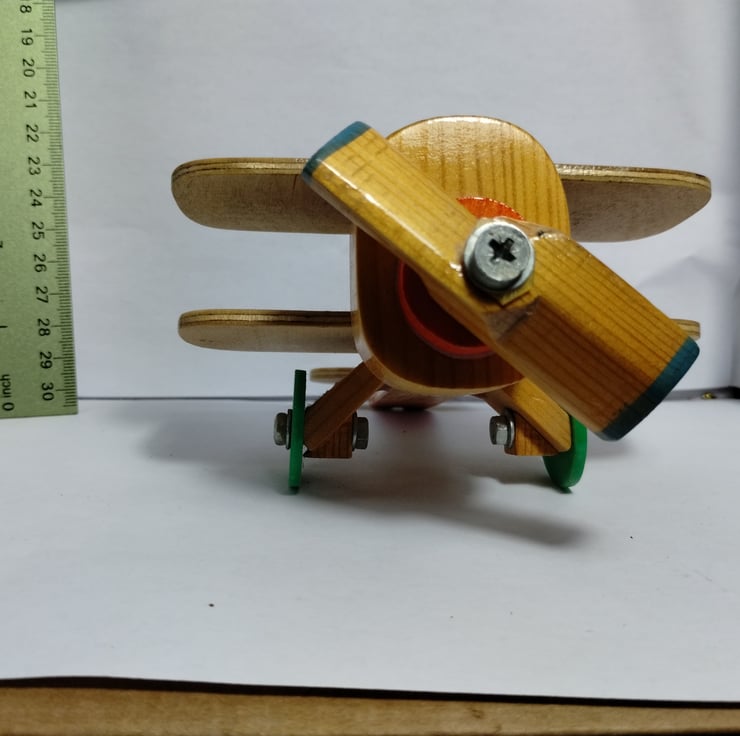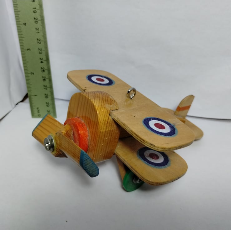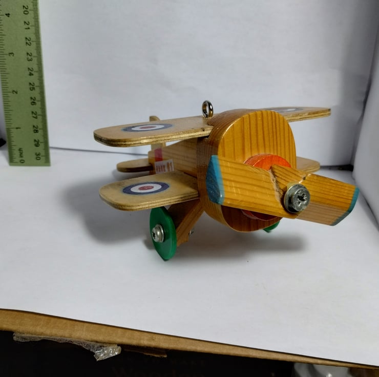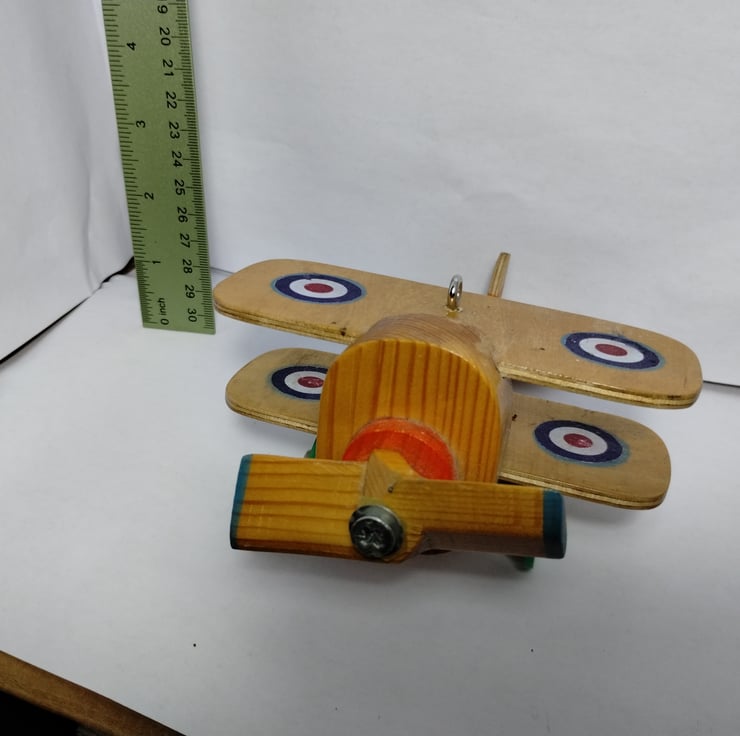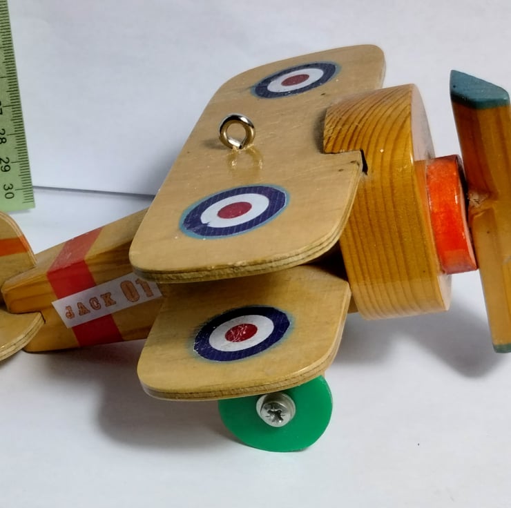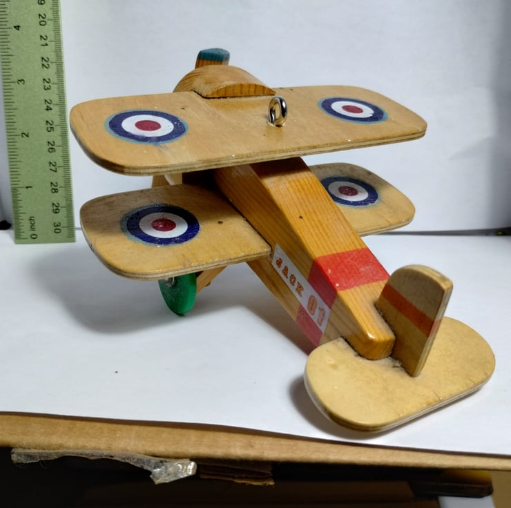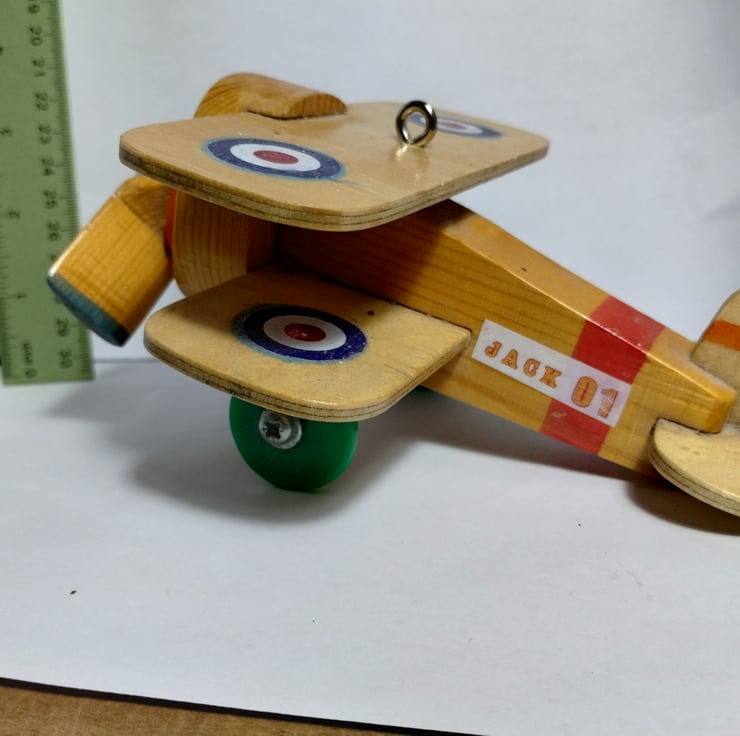 A model Bi Plane I made twenty years ago and it sat on my desk for years... (it has "Jack01" as a name on the side, which could probably soak off with a wet cloth, as it is a decal...) but hopefully someone will like it as it is. The propellor spins but the wheels are fixed (and not well centred, made in a rush all those years ago!). It has a certain charm, sold as second hand as it is a little battered but it has a certain charm. probably not suitable for under 36 months.
