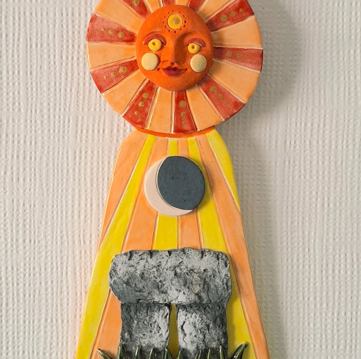 Handmade ceramic wall plaque featuring a cheerful Solstice sun rising over an ancient henge!