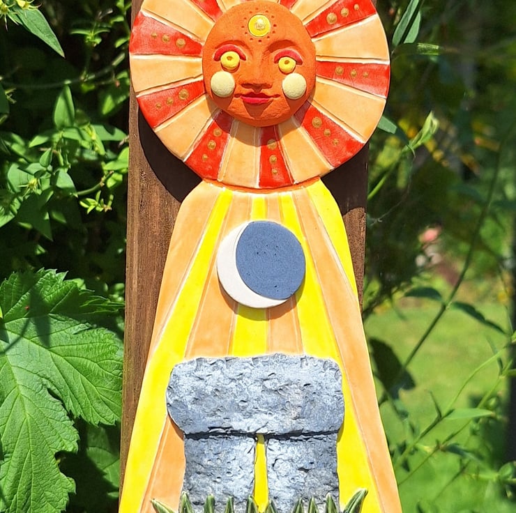 Each Sun plaque is lovingly glazed with a matt finish face and henge, and a body of glossy sun rays and grass. There are little touches of gold to add a summery glimmer! A wire hanger is on the back for wall hanging.