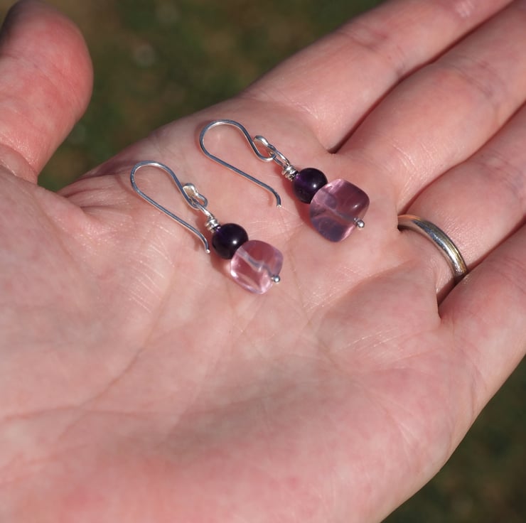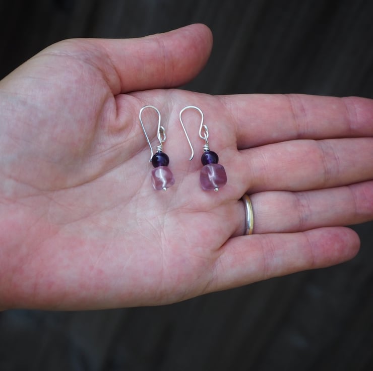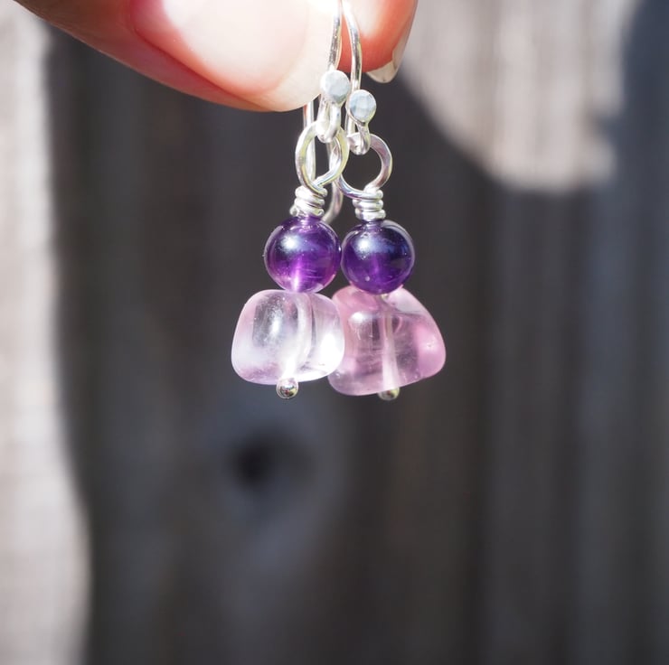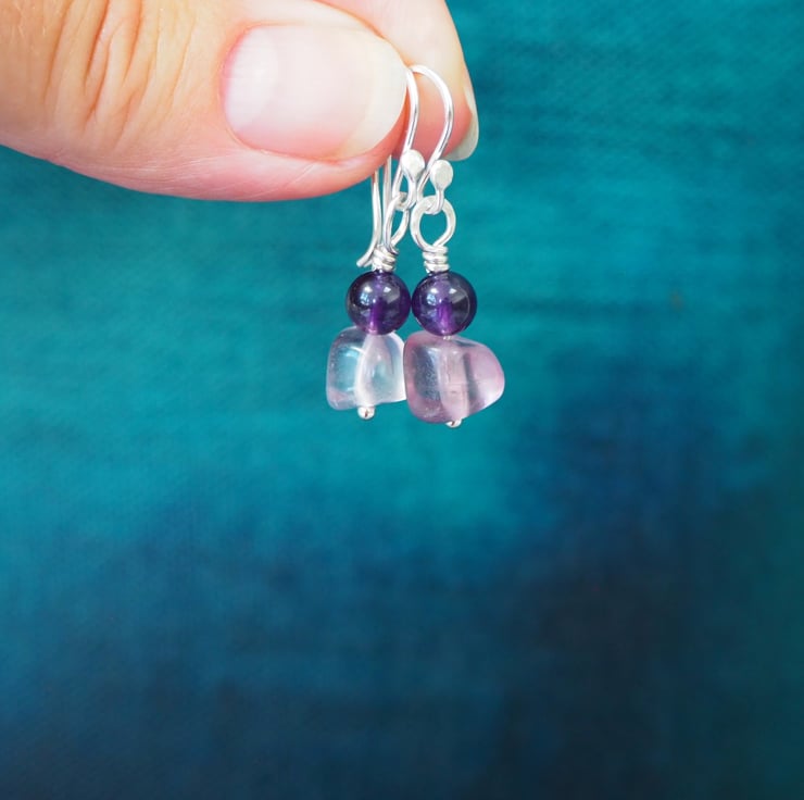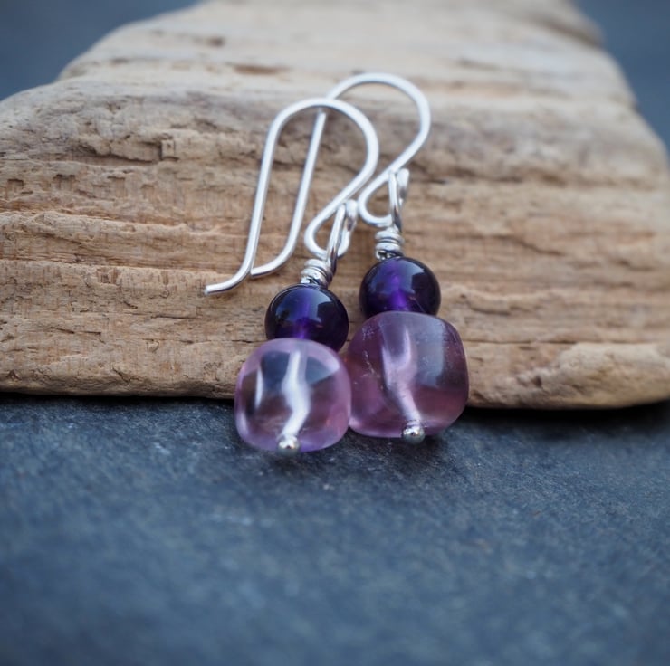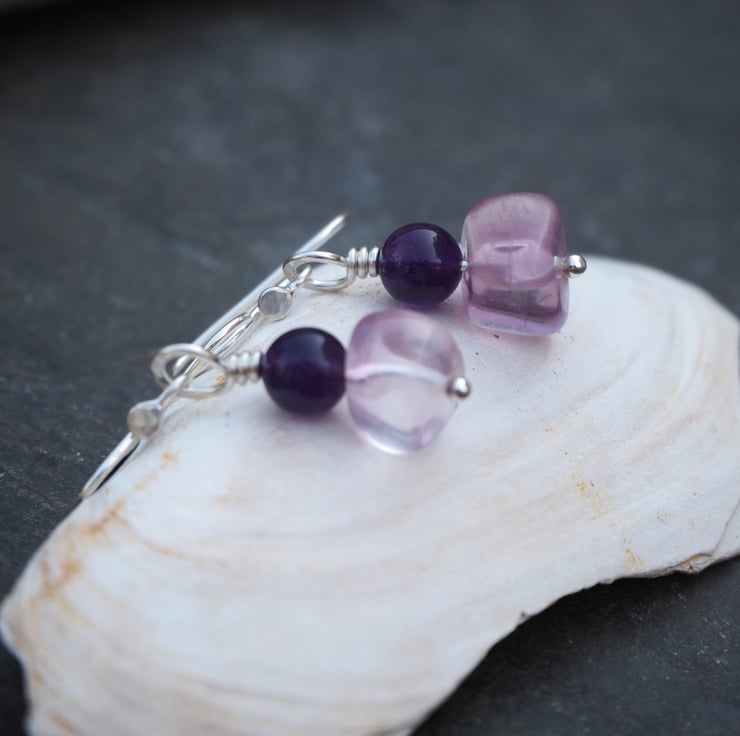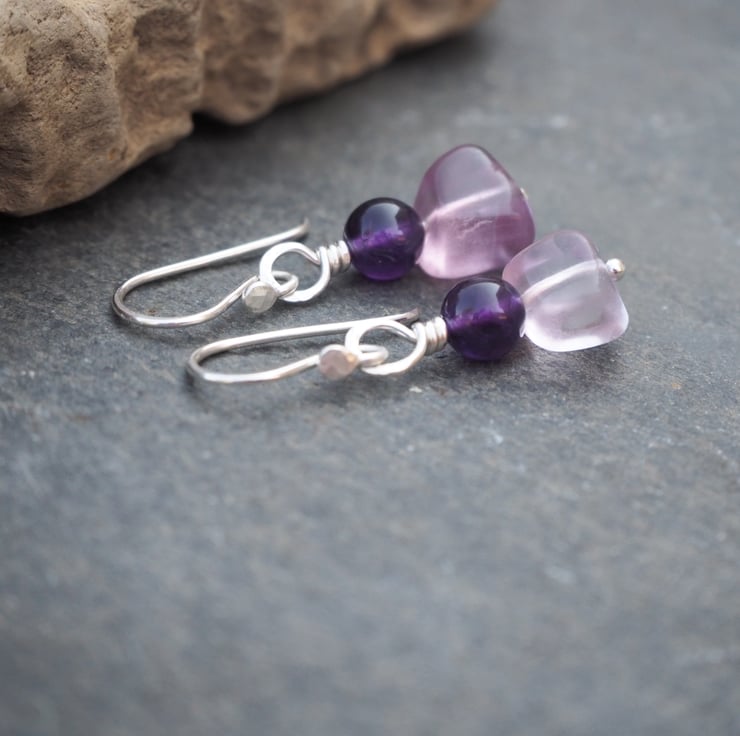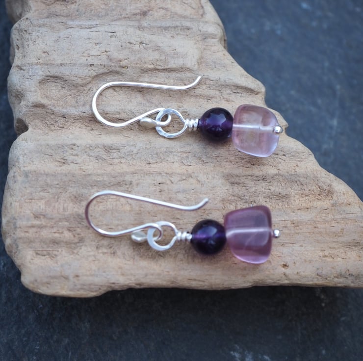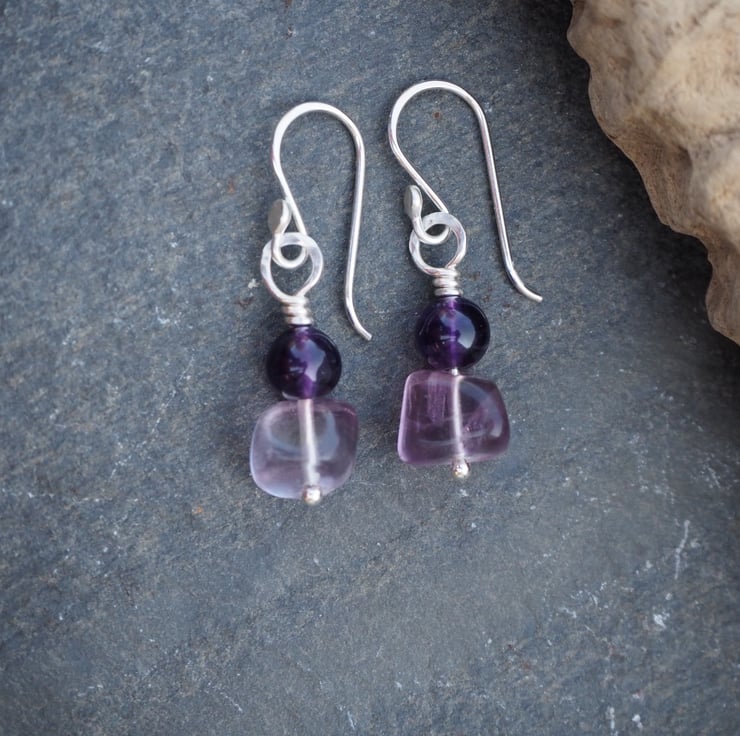 The fluorite pieces are not identical giving a lovely organic feel to the earrings. The deep purple of the amethyst complements the pale lilac fluorite perfectly. I've added some light hammered texture to the silver.