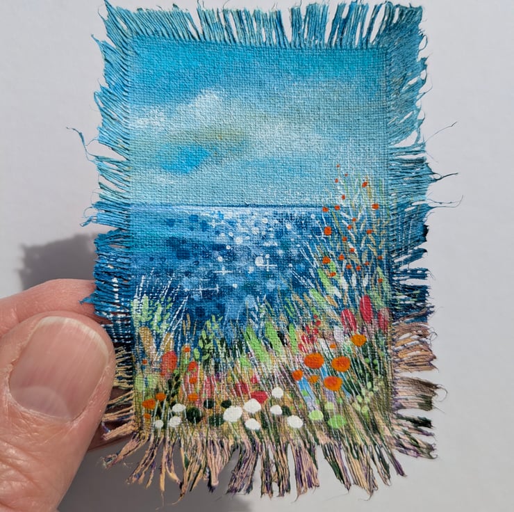 'A Secluded View' is a tiny, mixed media miniature, painted on fabric and float mounted into a custom A5 mount.