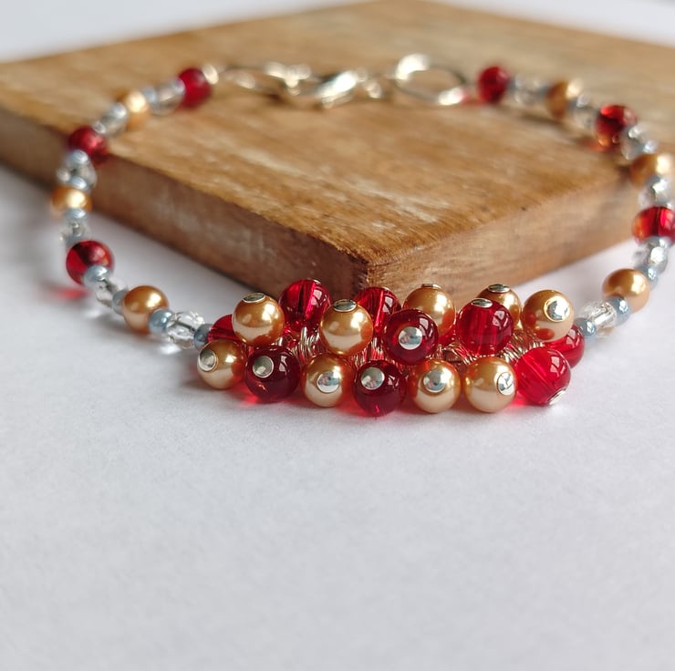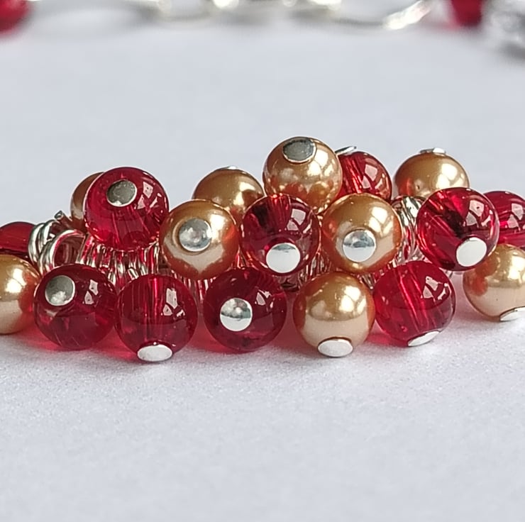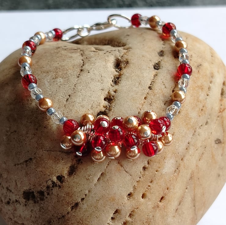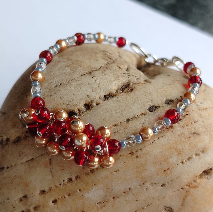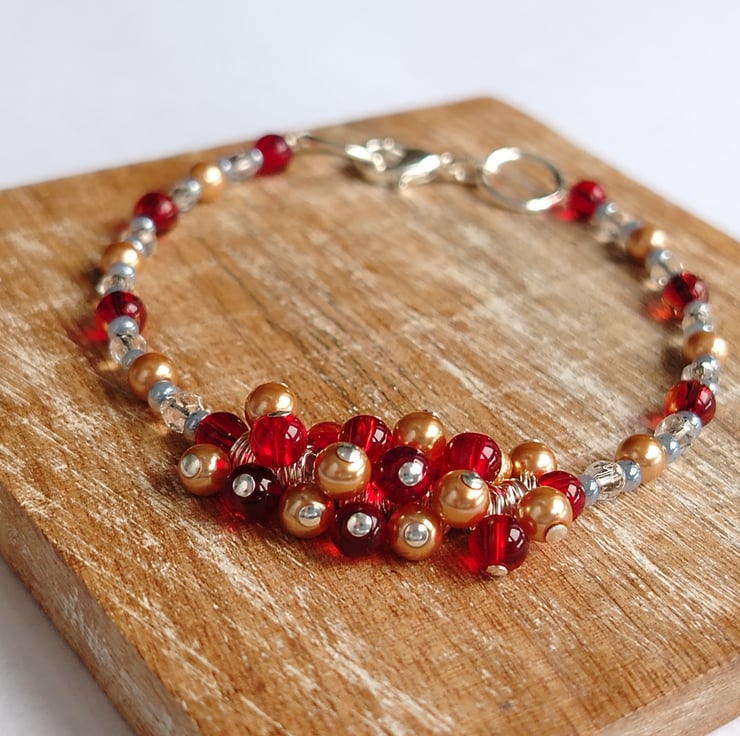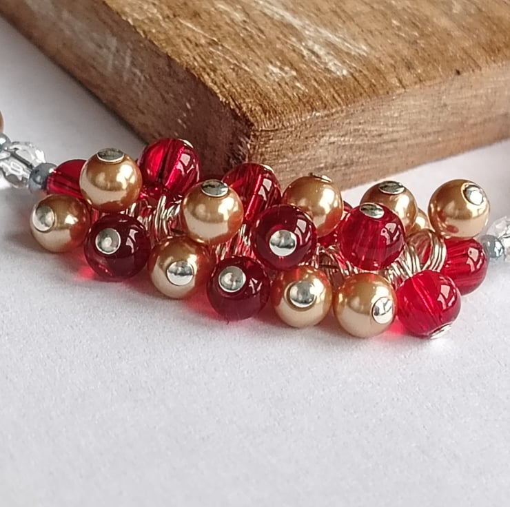 A handmade Red and Gold glass bead cluster bracelet is made with very pretty