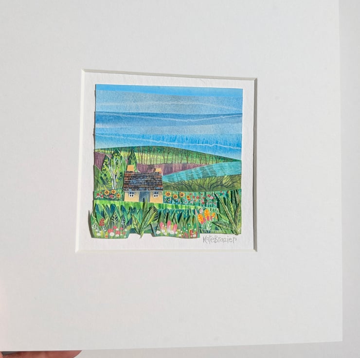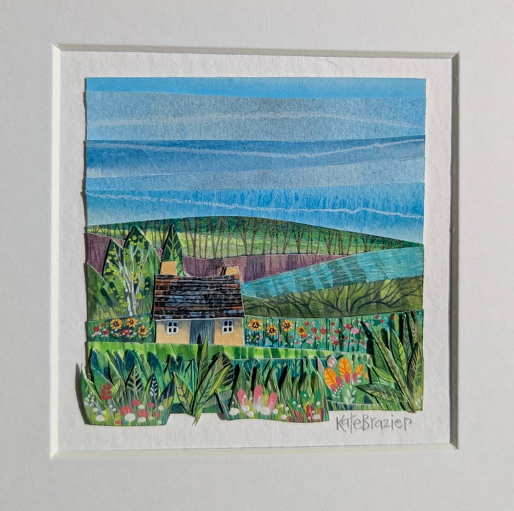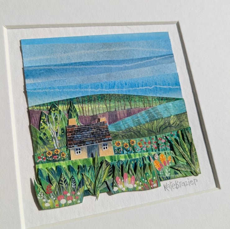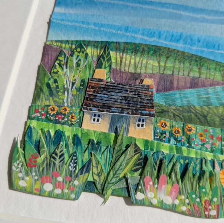 'Summer Cottage' is an original paper collage, created using a mix of mediums - including gouache paints, water soluble pencils and different weight and texture of papers.