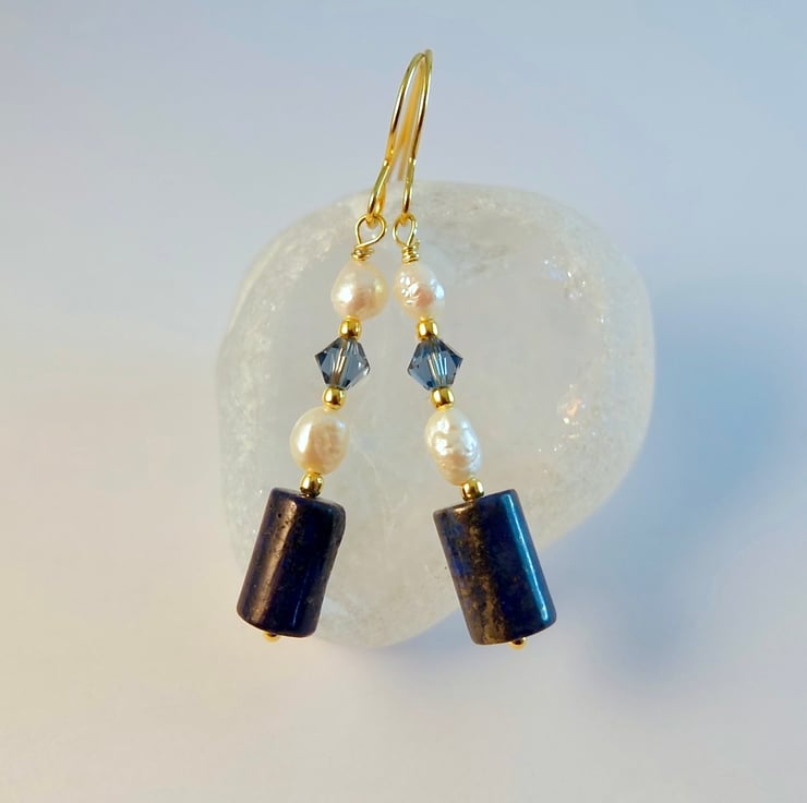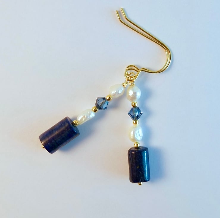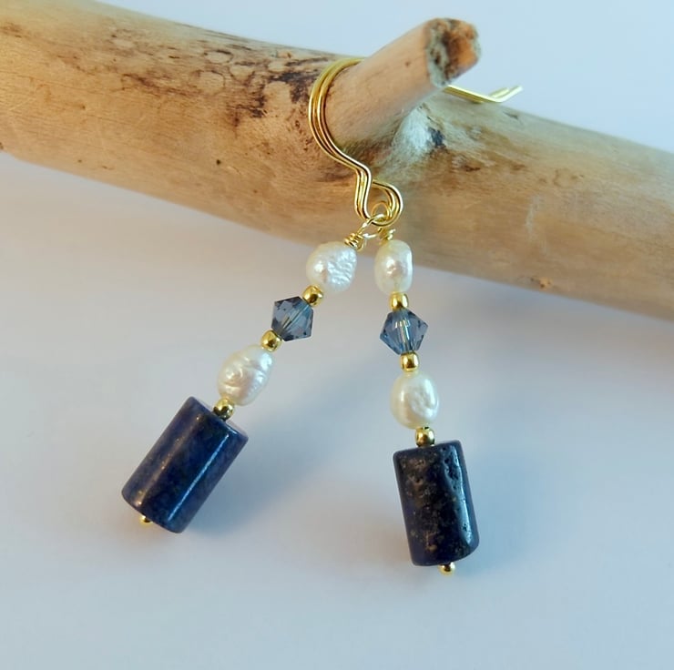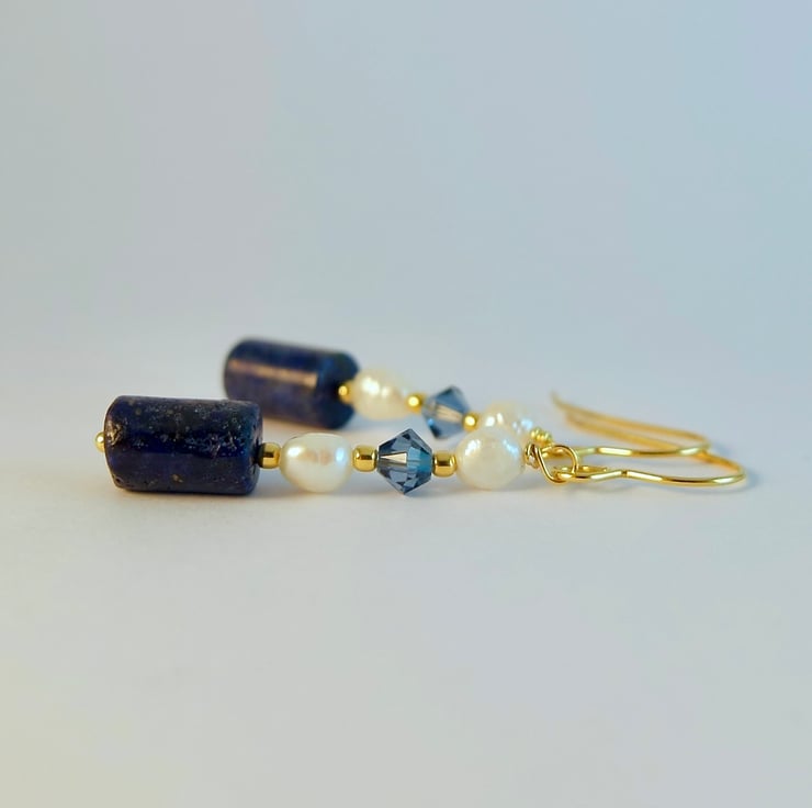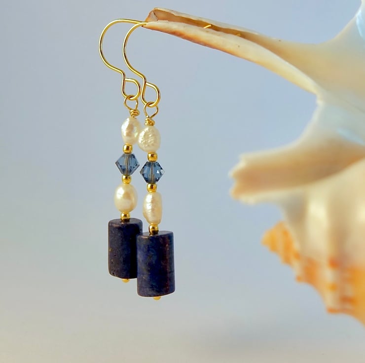 Each drop earring each features a 6x10mm Lapis Lazuli tube, topped with a pair of creamy-white freshwater baroque rice Pearls separated by a 4mm 'denim' Austrian crystal bicone, all highlighted with 1.8mm gold vermeil spacers.