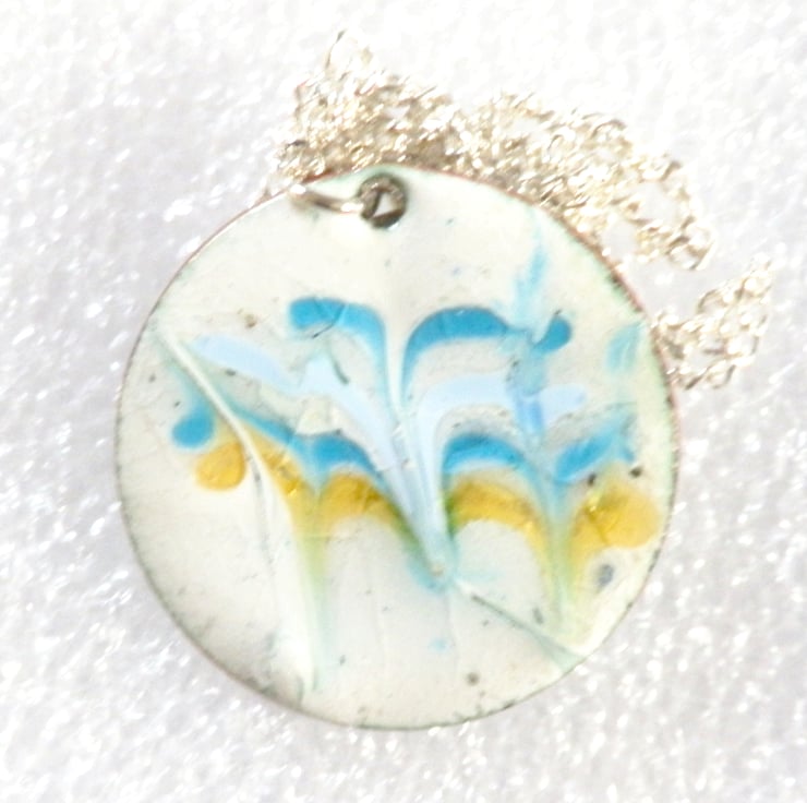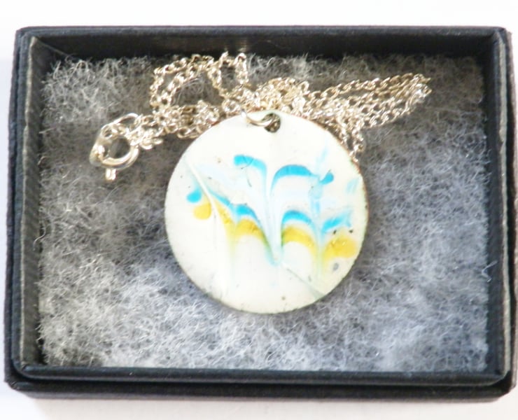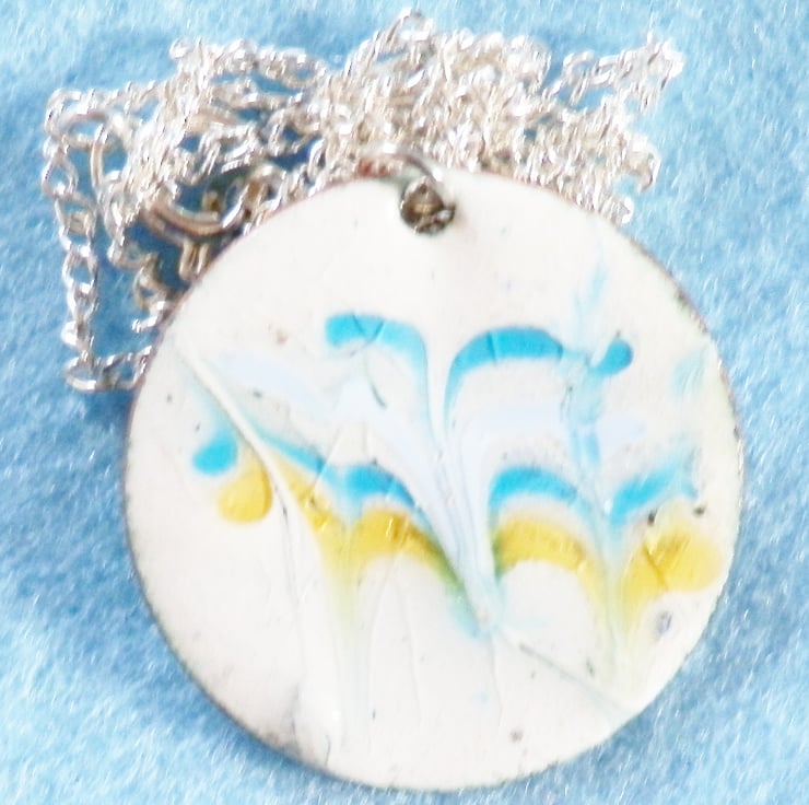 To make this pendant I have scattered the powdered enamel colours over a white enamel background and then drawn through the surface while the pendant was red hot in the kiln. I have limited control over the way the enamel will be drawn out by the steel point, resulting in the unique, random pattern. The pendant has a tactile element too, in that the enamel has not set flat after being disturbed and consequently there are dimples and runs in the surface that affect the way in which light is reflected from it.