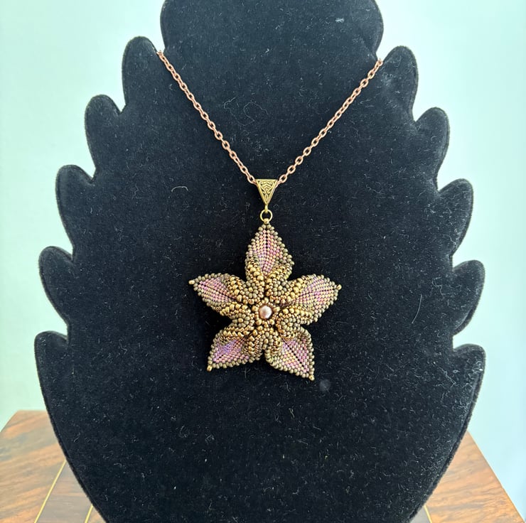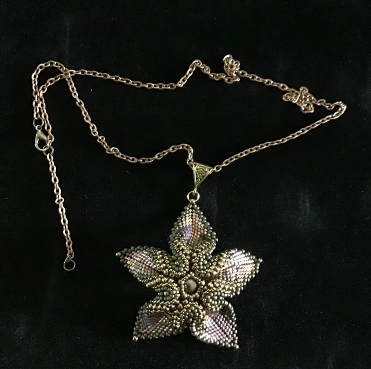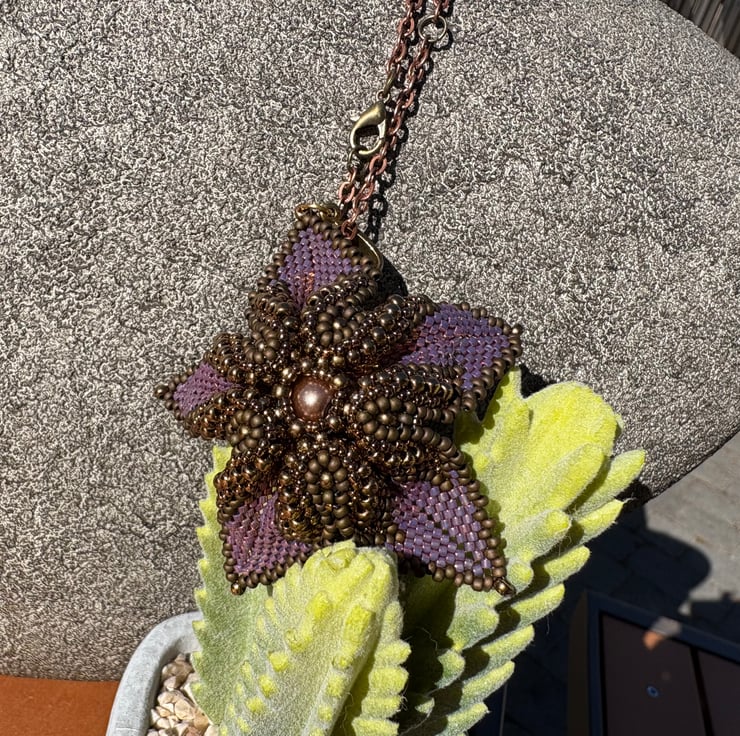 An unusual beaded pendant in the shape of a desert rose. This pendant is an intricate design featuring thousands of bronze, brown and copper japanese seed beads and many hours of work. It is a statement piece of jewellery. It measures approx. 7 x 7 cms and comes with a copper coloured chain measuring 50 cm with an additional 5cm extension.